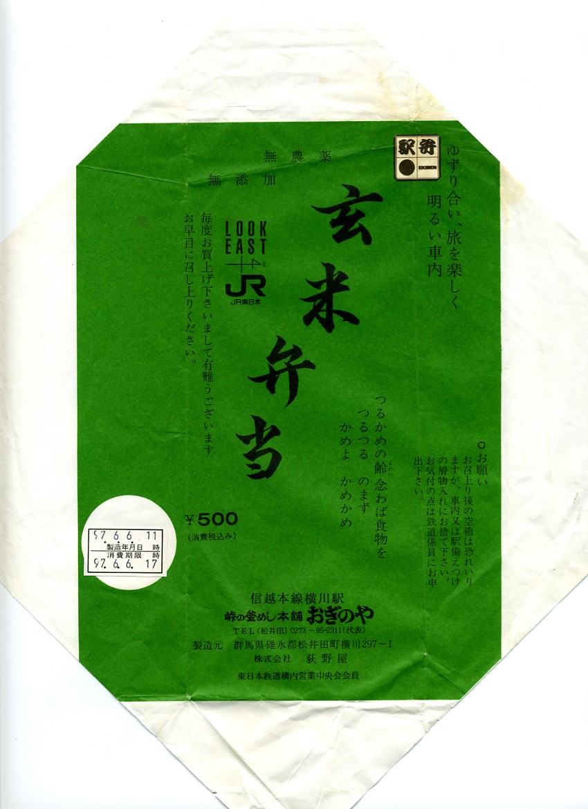 2003(平成15)年8月3日に購入した、横川駅弁の掛紙。この玄米弁当もまた、横川と日本を代表する駅弁「峠の釜めし」と同じく、1974年の発売時からその姿と中身を変えていない。下記の1997年のものと比べて、JR東日本の1990年前後の観光キャンペーン「LOOK EAST」のロゴがようやく取れ、駅弁マークが右から左へ移動し、食品表示が加わり、「無農薬」「無添加」の表記がなくなった。
