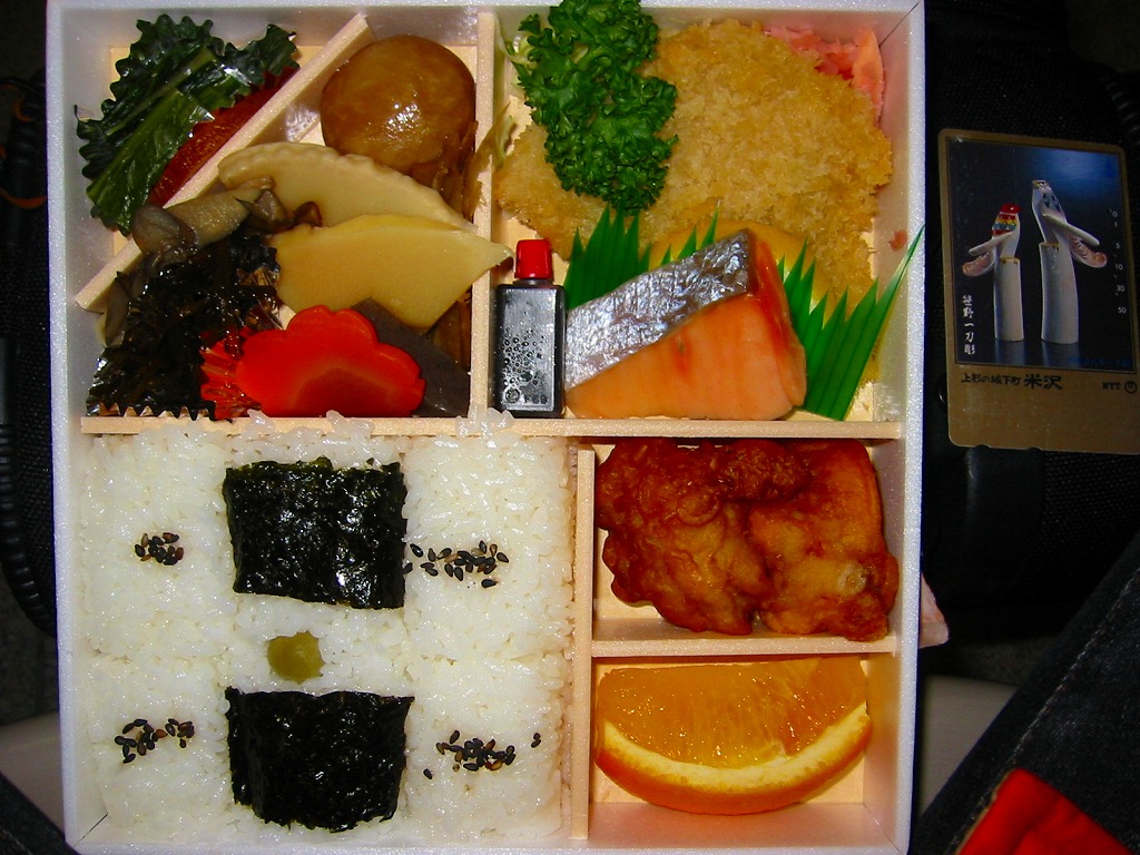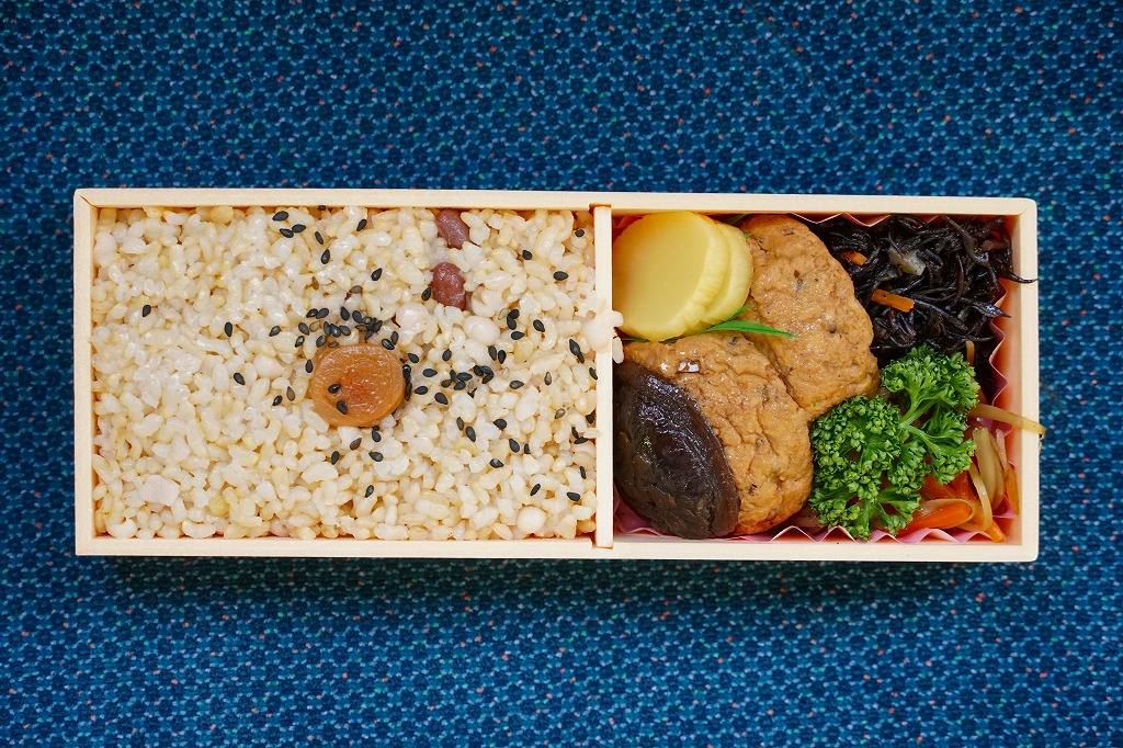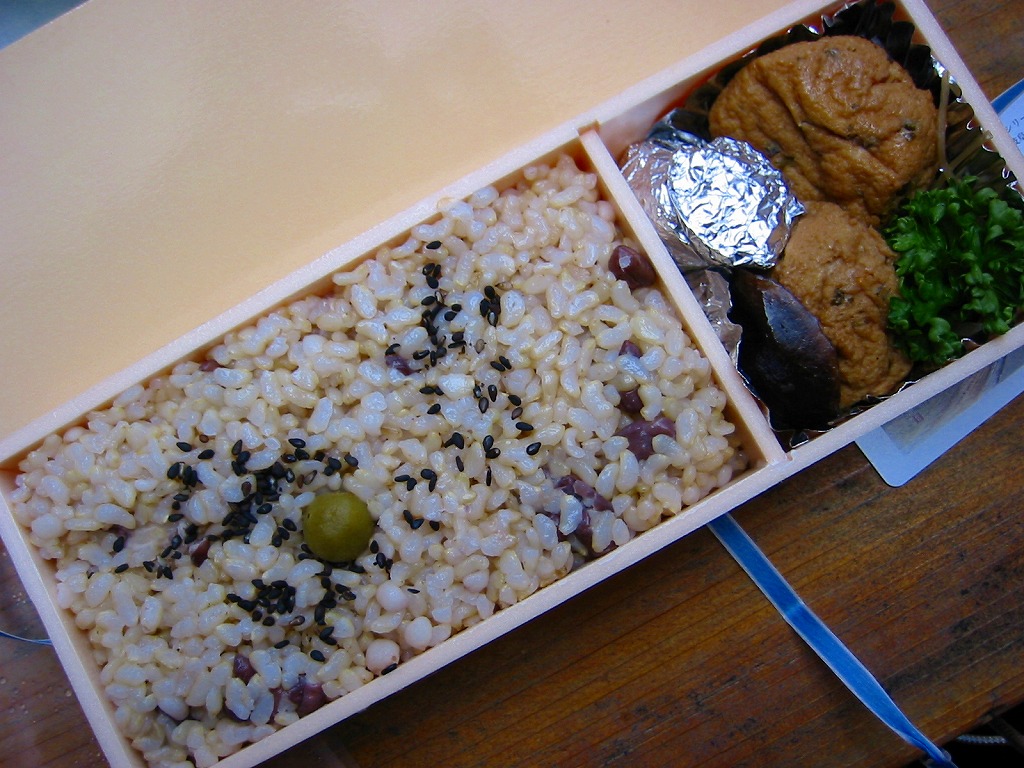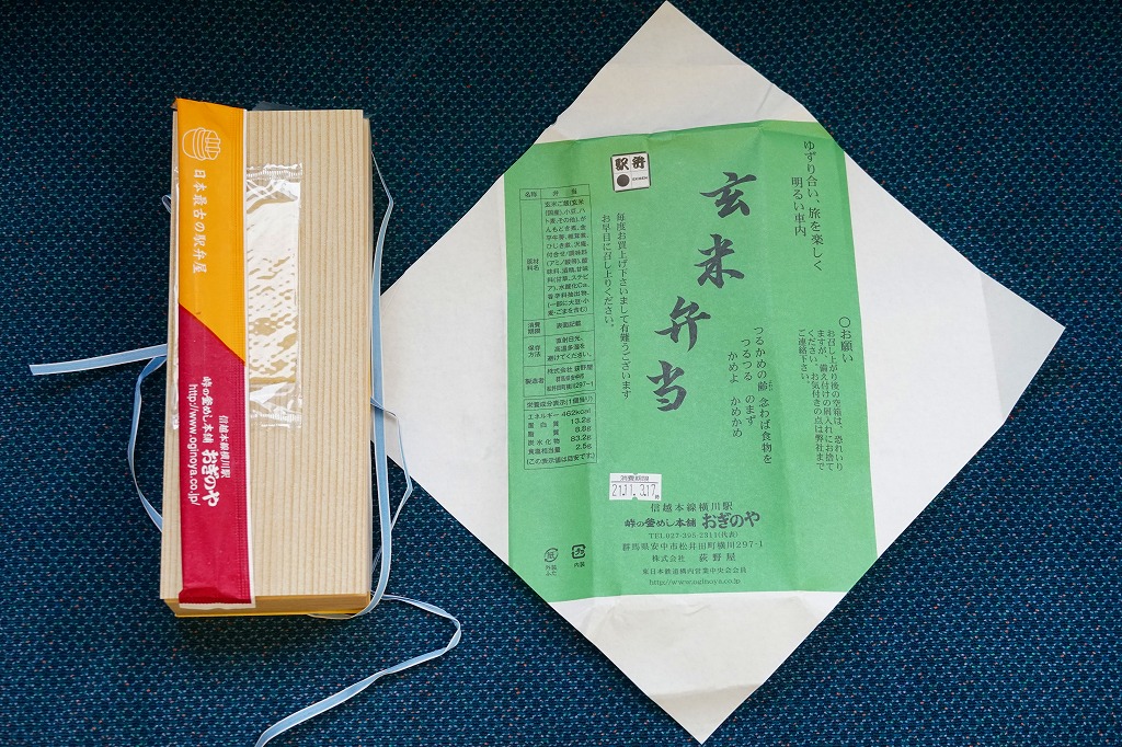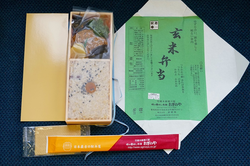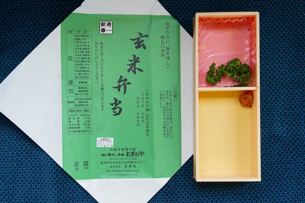 玄米が世に健康食として認知されるはるか前の、1974(昭和49)年12月に横川駅で発売。小柄でとても細長い長方形の容器の、6割くらいに玄米の日の丸御飯を詰め、残りにがんもどき、きんぴら、ひじき、しいたけ等のおかずを詰め込む。おかず要らずの味付け玄米飯は、おかずとともに歯応えが豊か。長らく500円だった価格は、2020年時点で650円、2023年時点で800円。