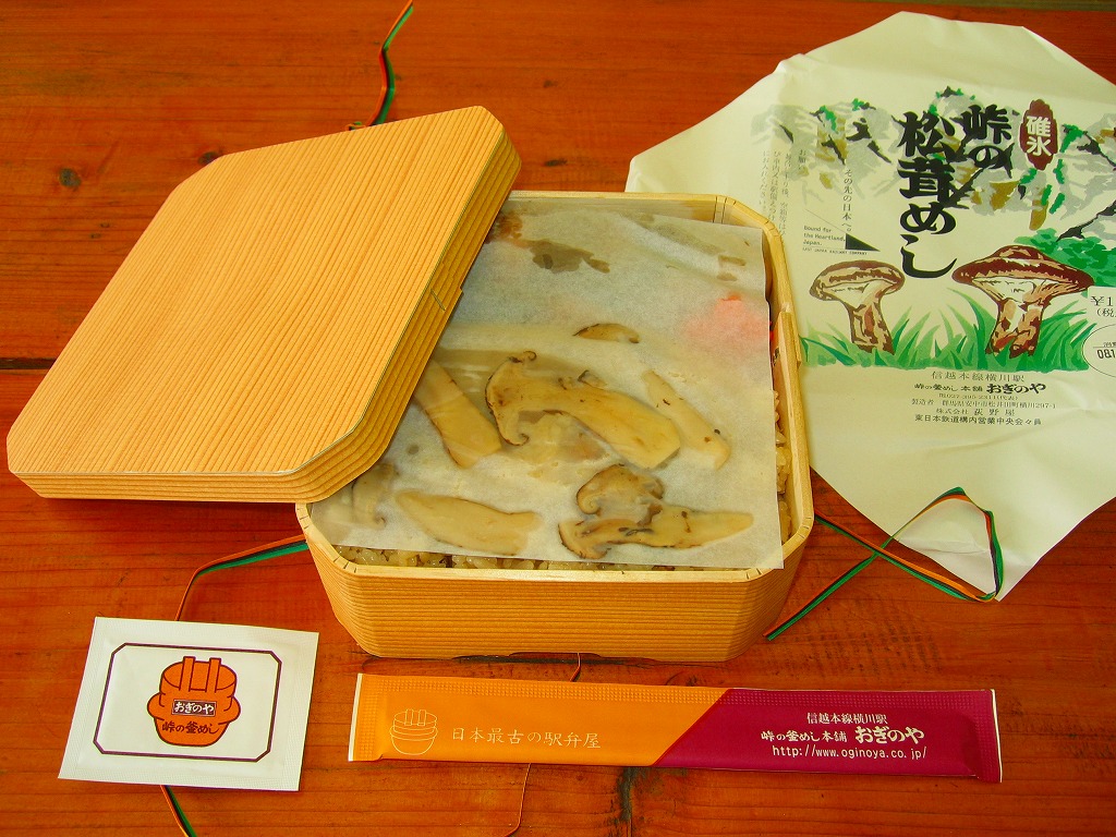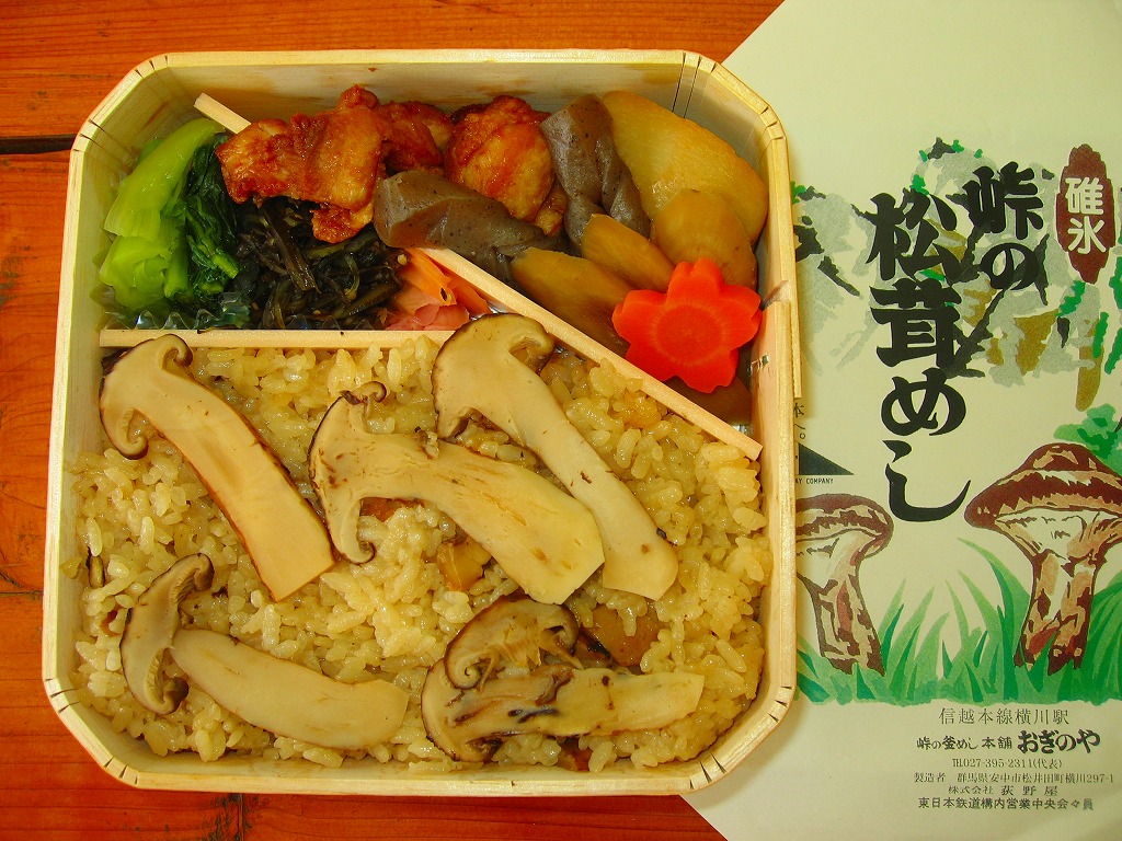形も大きさも厚さも部位も不揃いな松茸が、やはり松茸の小片をごろごろと混ぜた御飯の上に、にょきにょきと生えている本物の松茸飯。価格はしばらく1,700円であったが、2005年から1,900円。駅弁に使う松茸は駅弁屋所有の山から採ってくるとも、信州産が入荷した日だけ駅弁を作るとも言われる。