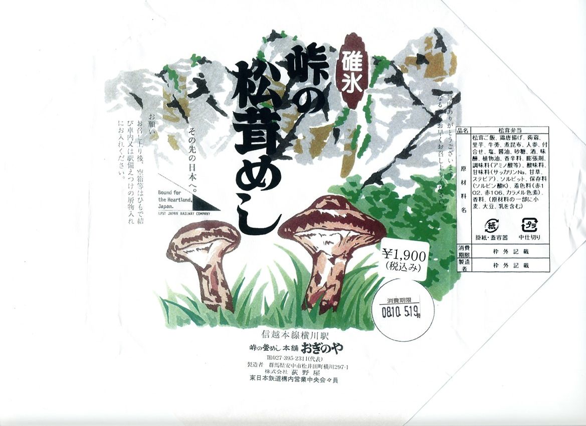 1983(昭和58)年に1,500円で発売か。横川駅で秋限定の駅弁であり、松茸駅弁の最高峰であり、入手が困難である幻の駅弁。9月頃から10月頃まで横川駅や軽井沢駅や一部の直営ドライブインで販売されるそうだが、発売期間が短いうえに販売個数も少なく予約も不可、入手に数年から十年以上を要した駅弁ファンがざらにいた。この日は11時に改札脇のそば屋に入荷したところを捕まえた。