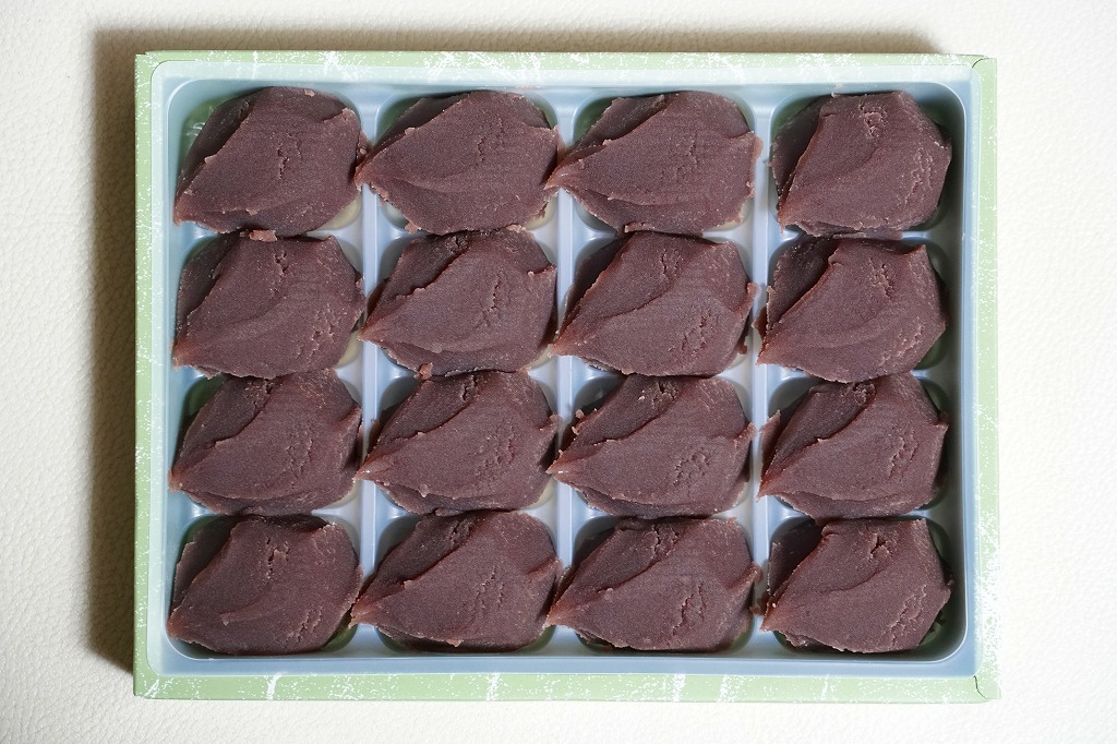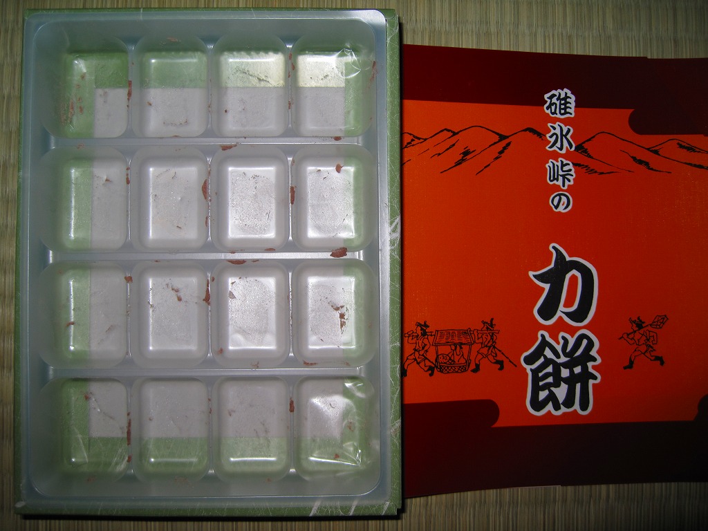 碓氷峠の力餅の、本来のパッケージ。紙箱に半透明のプラ製トレーを入れて、4×4=16個の力餅なるあんころもちが収納されている。日持ちはおそらく3日間。碓氷峠で力餅を売る店は、他にいくつかあるそうな。価格は2009年の購入時で735円、2023年時点で864円。