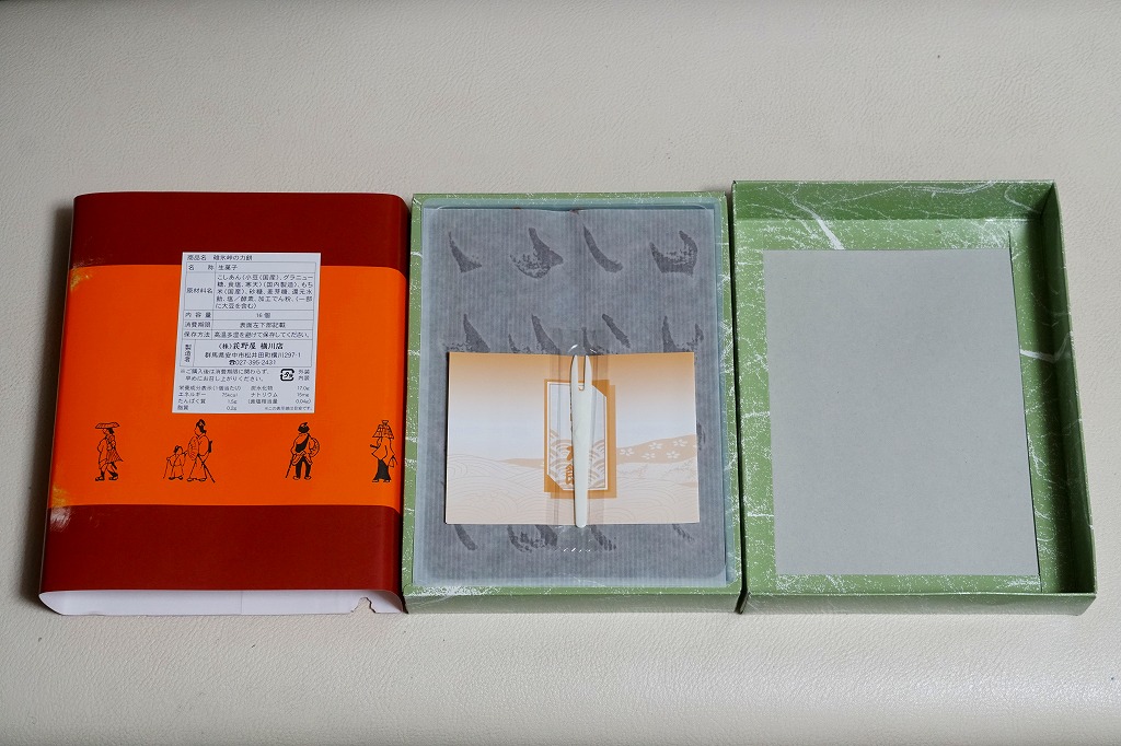 全国各地の峠道で見掛ける「峠の力餅」の碓氷峠版。厳選された小豆と餅米を使用し、さっぱりとした甘さだというあんころもちが6個入っている。自身の足で歩かずに電車で楽して来てしまうと、当然に甘ったるい。2003年時点で24個入りは1,050円、16個入りは735円、この6個入りは価格を失念していたが、後の訪問で315円と判明。2023年時点で24個入りは1,188円、16個入りは864円、この6個入りは400円。