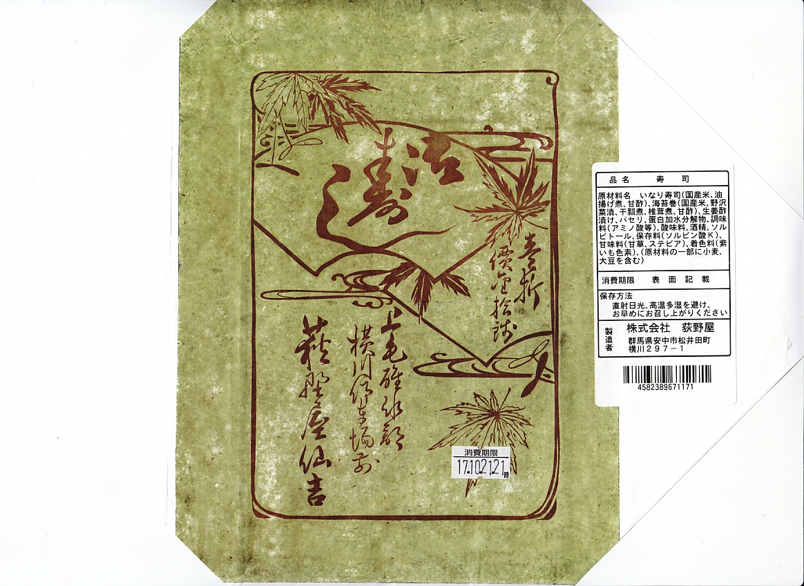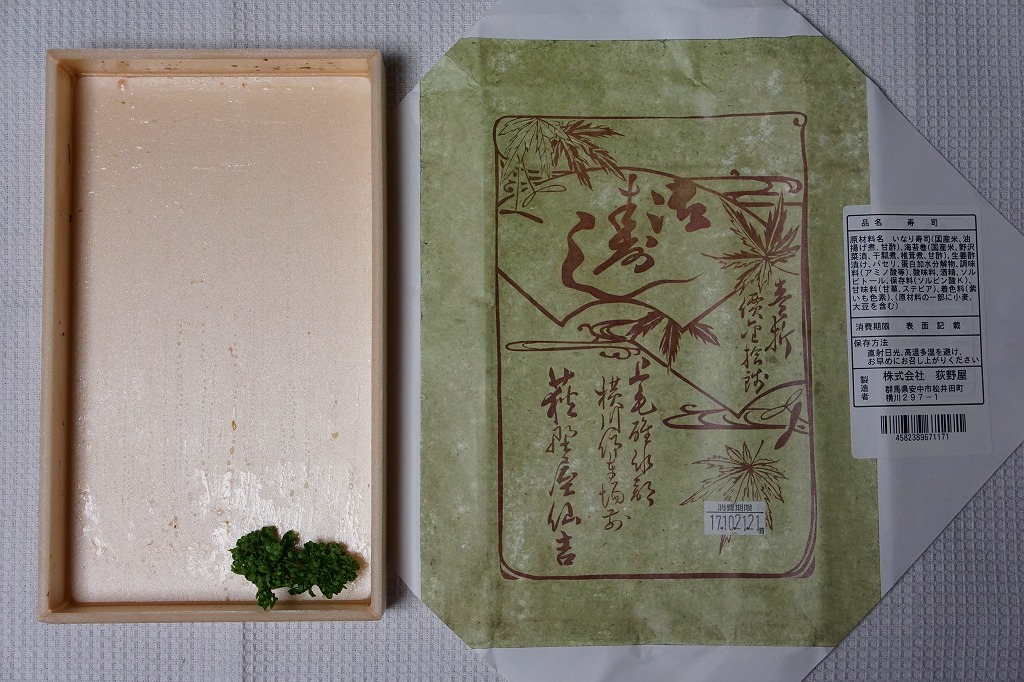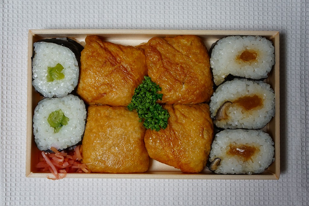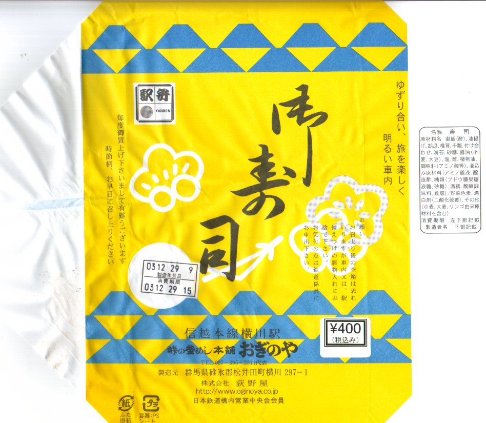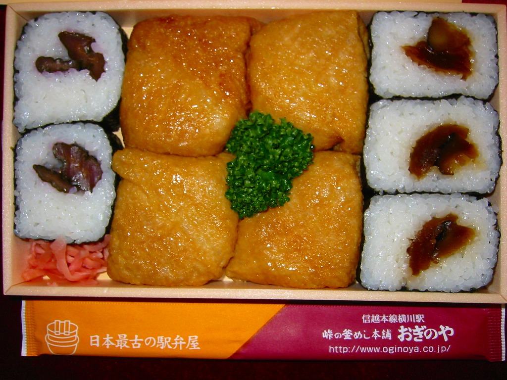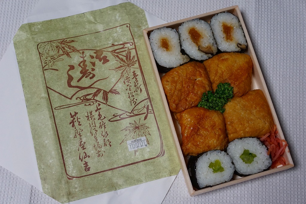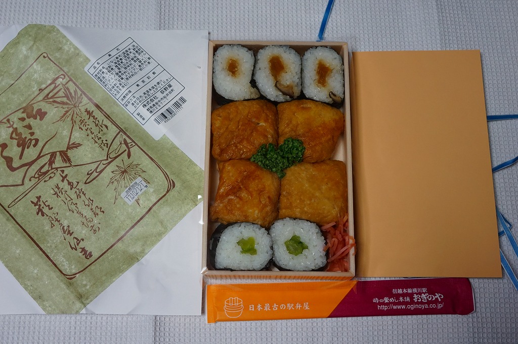横川駅で唯一の寿司駅弁。発泡材に紙のふたながら古めかしいサイズの容器に、公式サイトのURL付きながら古風な掛紙をかける。中身は正方形平坦な稲荷寿司4個と薄っぺらな太巻き5個。稲荷寿司の風味もさることながら、太巻きの具はなんと芝漬けと奈良漬け。腹が空いていても食が進まないガッカリ駅弁、または古風な見栄えを楽しむ駅弁。