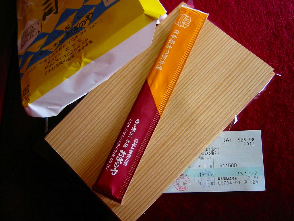 横川駅の幕の内弁当。意味もなく「峠の」という枕詞が付くのが横川駅弁らしい。中身は俵飯に鶏唐揚や焼き魚や煮物が入る普通の幕の内駅弁で、その内容も味も格別なものはないが、そこはやはり横川駅らしく、掛紙のデザインを中心にパッケージからは旅のお供の駅弁らしさが感じられる。