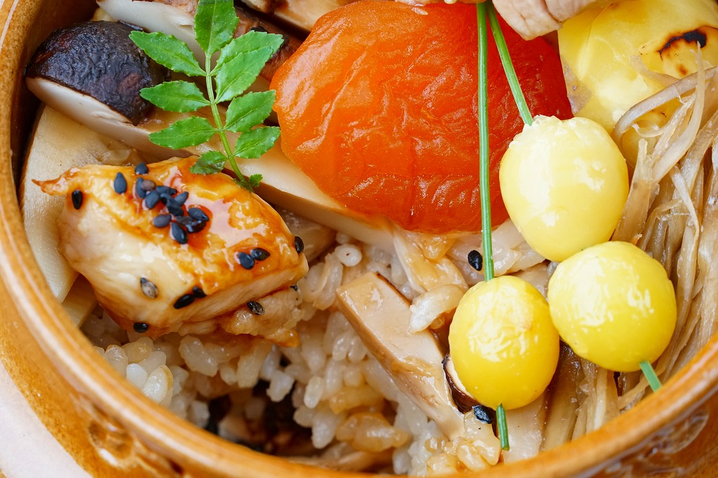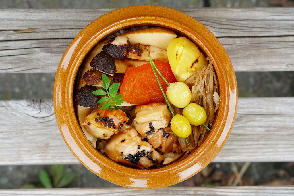 上げ底も加わって高さのある、角を落とした正方形の経木枠の容器に、木目調のボール紙でふたをして、インクジェット印刷の大きな掛紙をかけて、ひもで十字にしばる。中身はマツタケの炊込飯に鶏唐揚、コンニャクやサトイモやニンジンやゴボウの煮物、付合せなどを添えるもの。