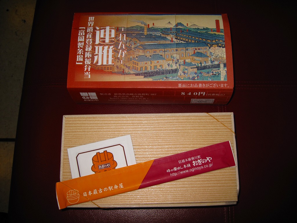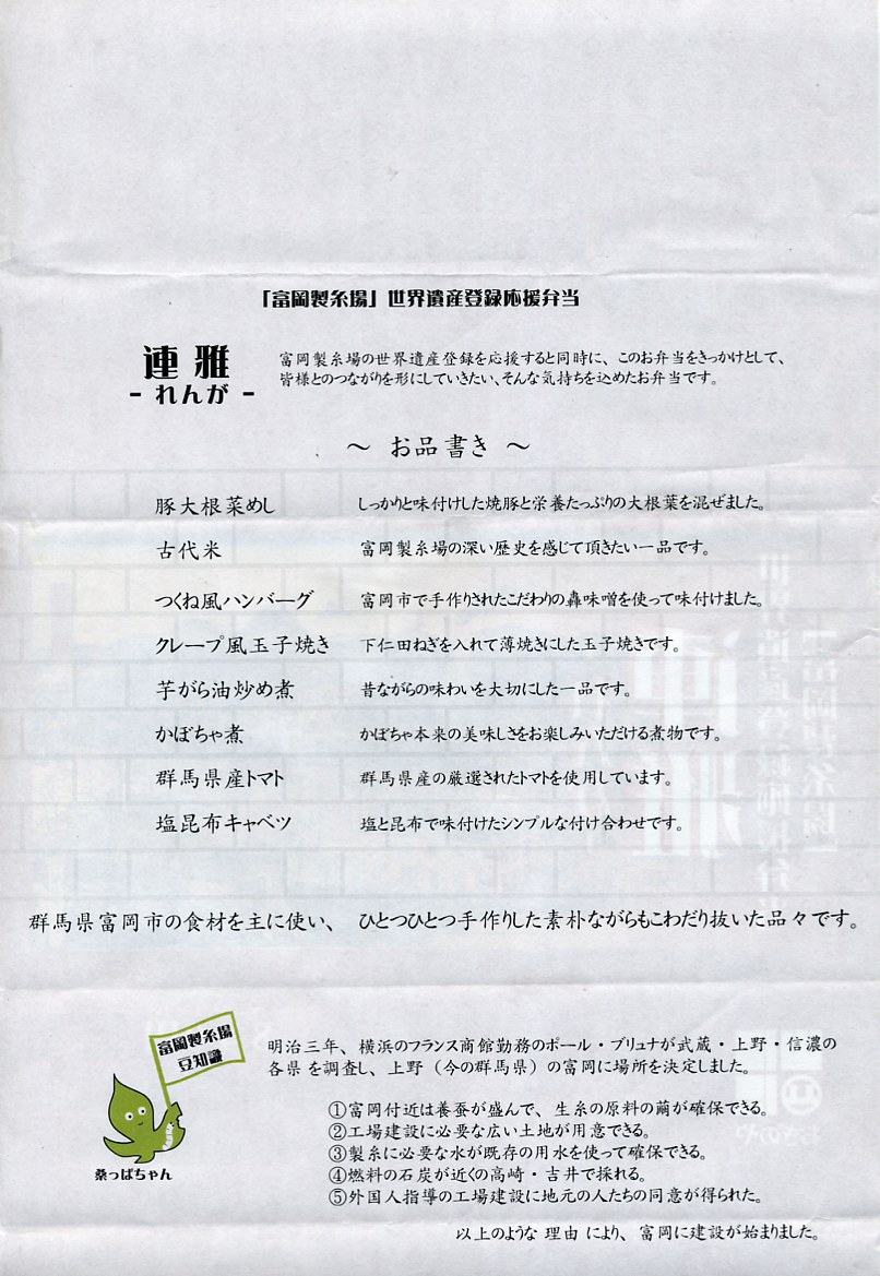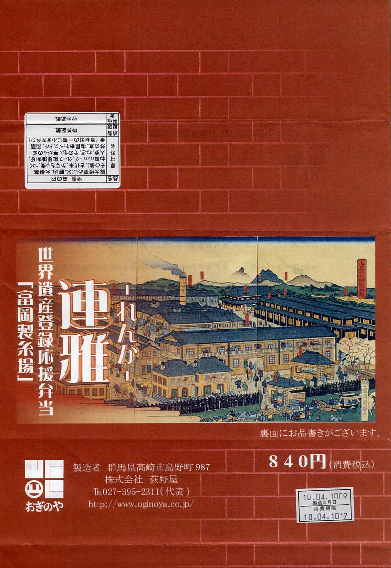 2009年10月と2010年4月の東京駅での東日本縦断駅弁大会で販売された横川駅弁。3日前までの予約が必要な商品として、2009年の夏には駅弁屋のドライブインで登場していた模様。「「富岡製糸場」世界遺産登録応援弁当」の副題が付く。