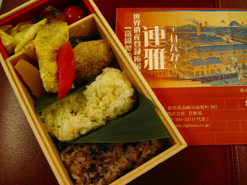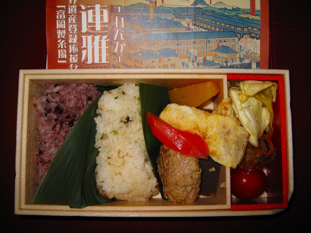 長方形で二重構造の容器を、富岡製糸場の錦絵や赤煉瓦を印刷した掛紙で包む。中身は笹の葉で仕切られた古代米と豚大根菜の御飯、つくね風ハンバーグとクレープ風玉子焼、ミニトマト、かぼちゃ煮、こんにゃく、芋がら油炒めなど。群馬県富岡市の食材を主に使用したそうで、掛紙の裏面にコンセプトともども記される。内容や調理法は個性的なのに、奇抜な雰囲気のない落ち着いたお弁当。
