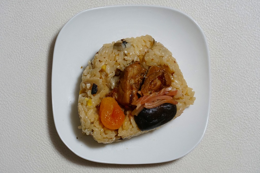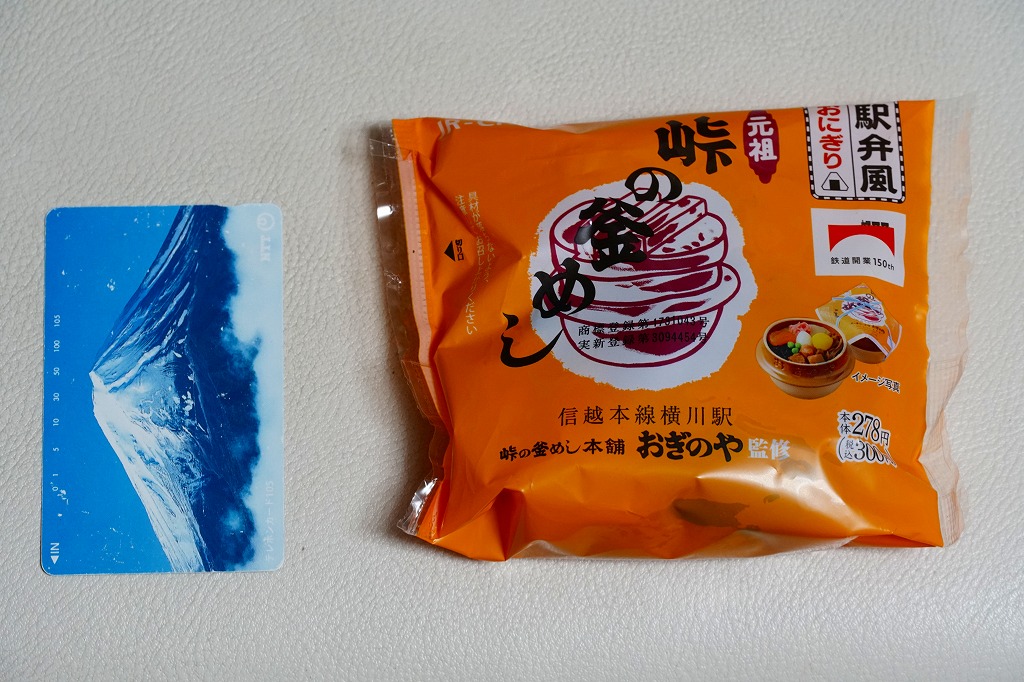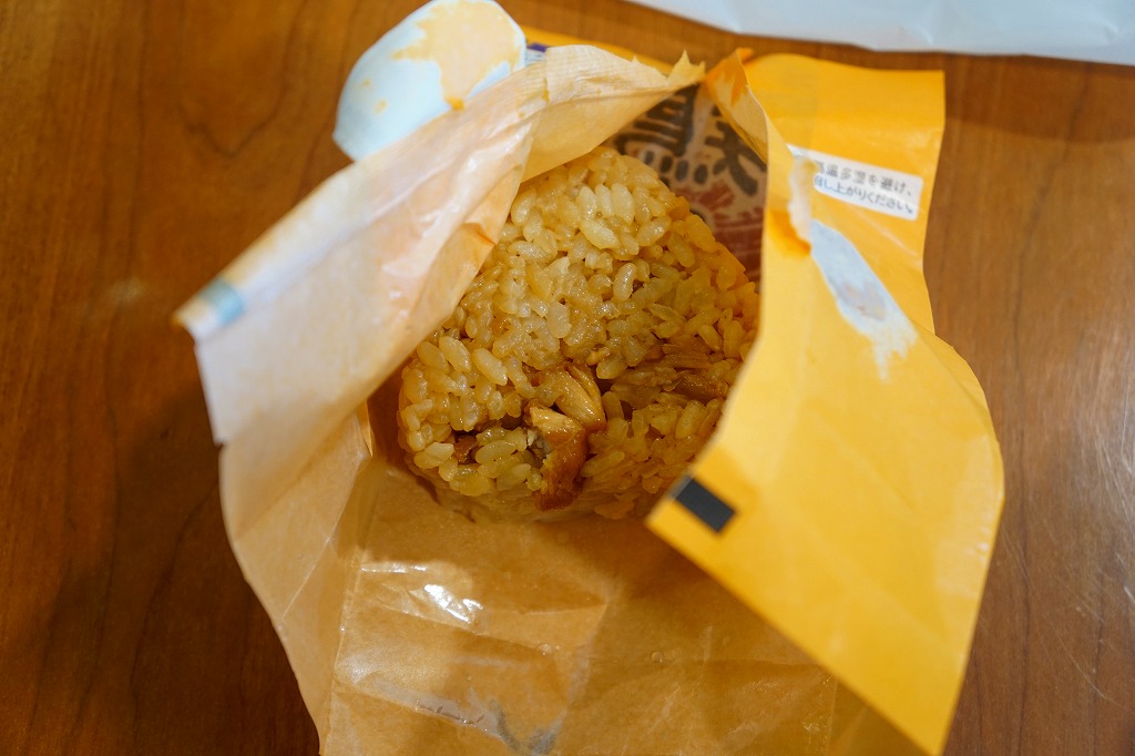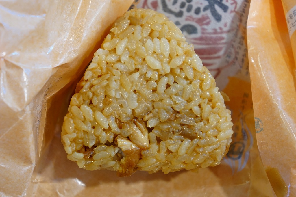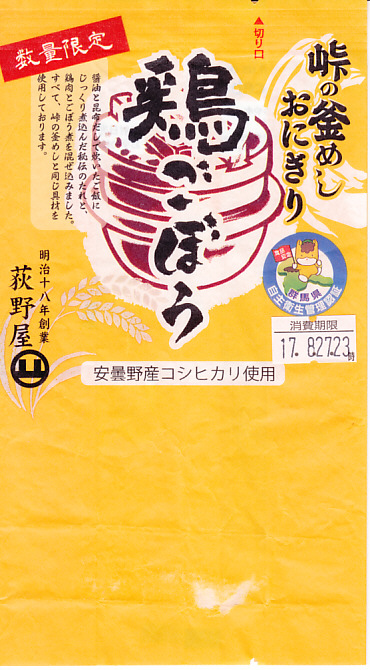 これは横川駅弁の荻野屋が監修し、埼玉県のJR東日本クロスステーションが製造し、駅のコンビニで販売する企画商品。駅弁の峠の釜めしの掛紙と同じ絵柄の袋に、鶏肉とシイタケと紅生姜とアンズを具にした、栗とごぼうとシイタケの炊込飯でできたおにぎりを詰める。「峠の釜めし」のおにぎりは上記のとおり公式に現存し、軽井沢駅やドライブインで販売されるが、こちらは鶏飯から一歩踏み込んで、おにぎりにあるまじき具を入れることで、より駅弁の「峠の釜めし」に似せてきた気がした。