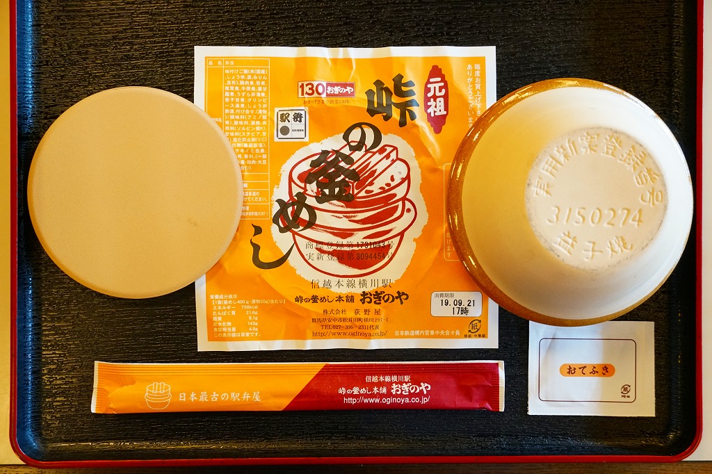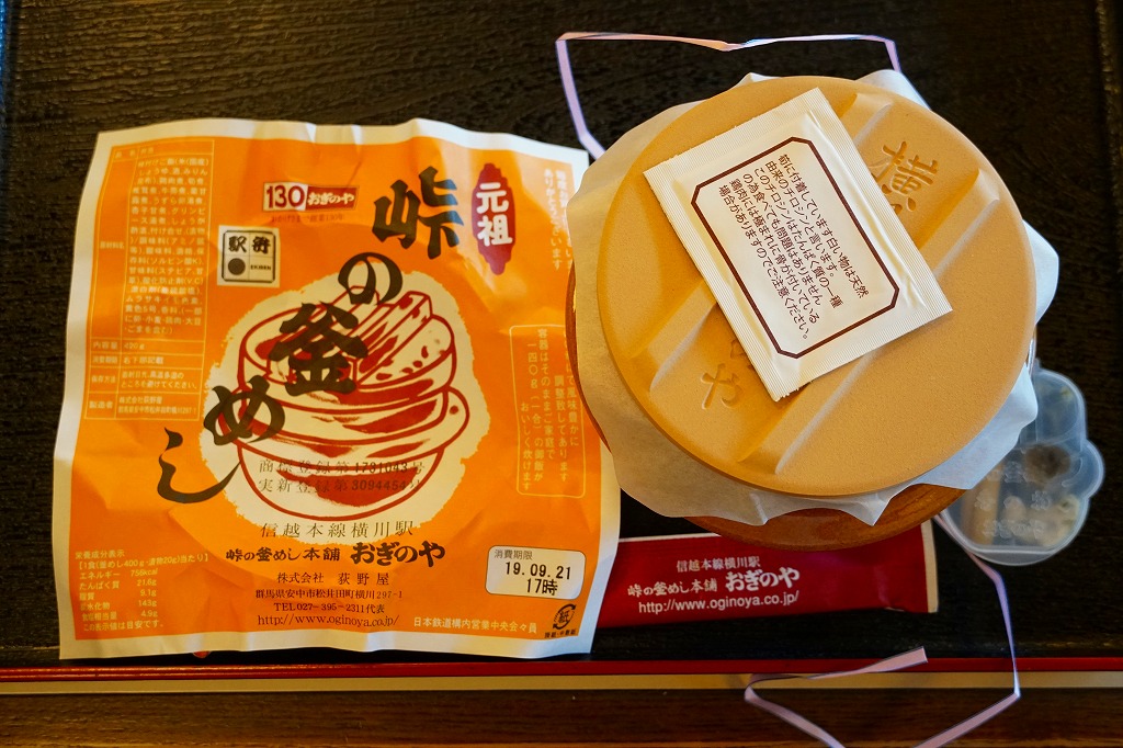 上記の駅弁「峠の釜めし」の、2019(令和元)年時点での姿。上記の2025年のものと、まったく変わらない。値段はだいぶ変わった。