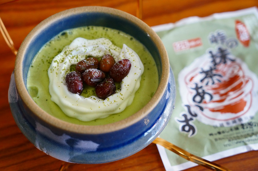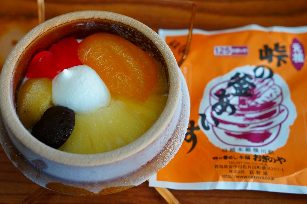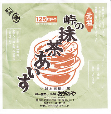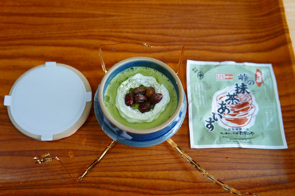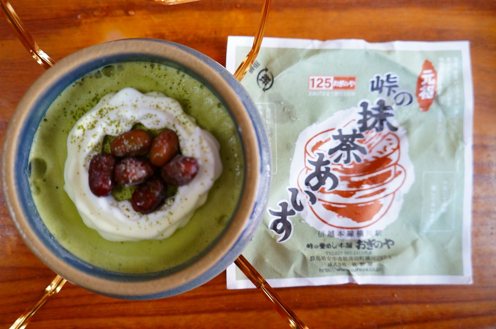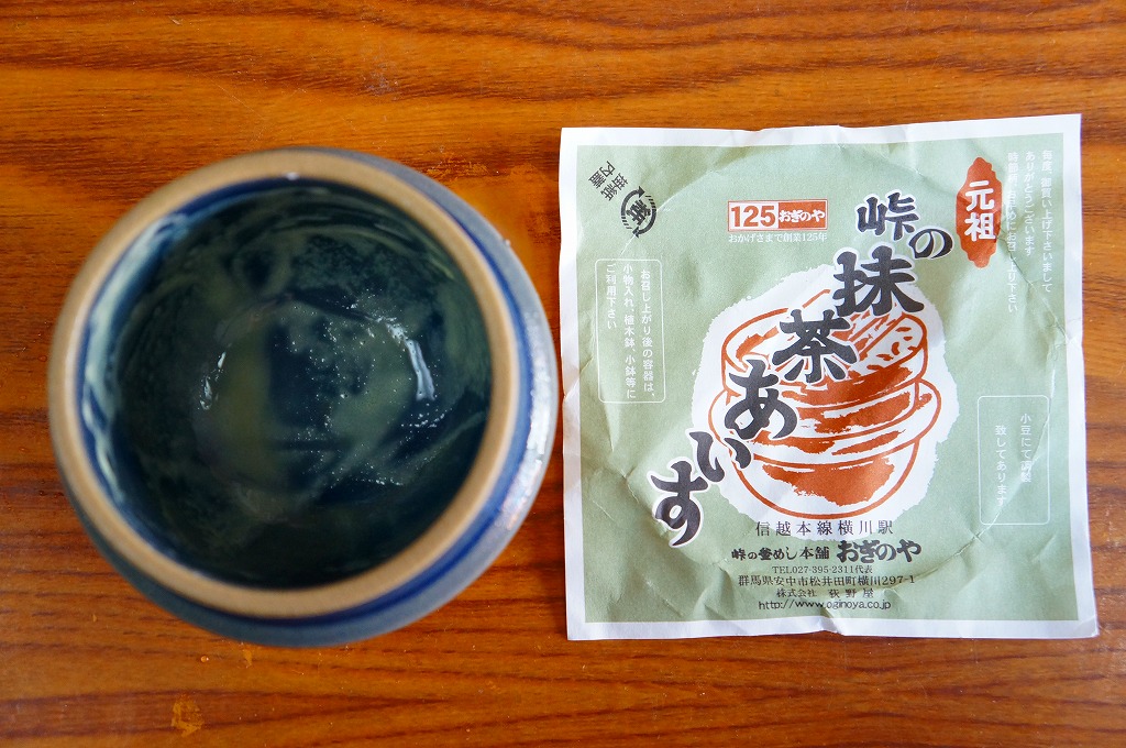 2005(平成17)年か、それ以前の発売か。駅では売らず、上信越自動車道横川サービスエリアが主戦場。駅弁の昔の「峠の釜めし」そっくりで、4割くらいの大きさのとても小さな陶器の釜に抹茶アイスを詰めて、あずきとクリームを載せる。