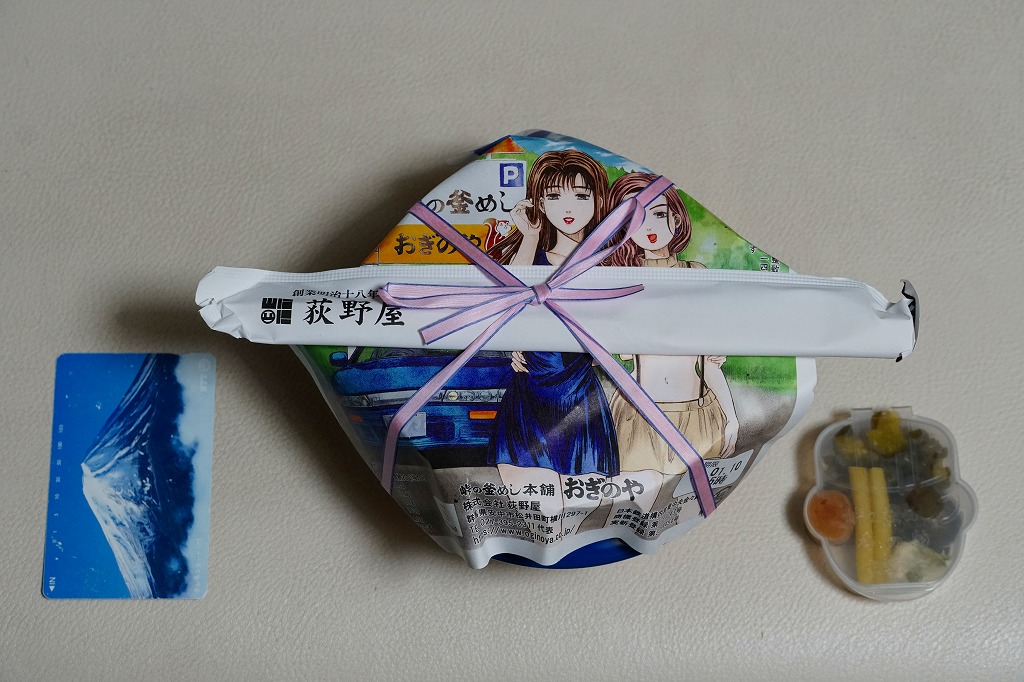 これは「真子&沙雪ver.」。作中の物語にちなみ、女性キャラクター2名が峠の釜めしの看板と青い車を背景に並ぶ。益子焼の陶器も車と同じ青色をしている。中身は普段の「峠の釜めし」と同じく、茶飯を鶏肉やタケノコやゴボウにクリやうずら卵やアンズなどで覆うもの。値段は400円高いけれど、価格を気にしてこれを買う人はいないだろう。