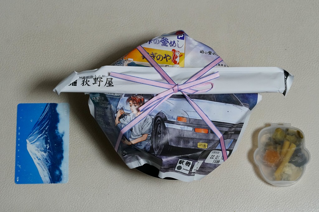 これは「拓海ver.」。作中の物語にちなみ、峠の釜めしの看板の前で、男性キャラクターが白黒のスポーツカーに寄りかかる。益子焼の陶器は車の下半分と同じ黒色をしている。中身は普段の「峠の釜めし」と同じく、茶飯を鶏肉やタケノコやゴボウにクリやうずら卵やアンズなどで覆うもの。値段は400円高いけれど、価格を気にしてこれを買う人はいないだろう。