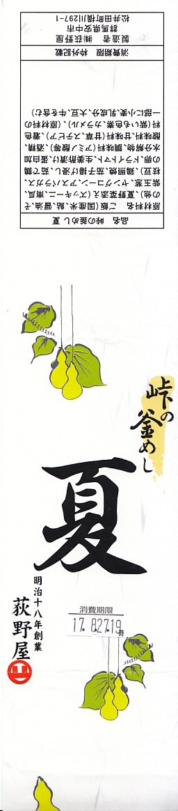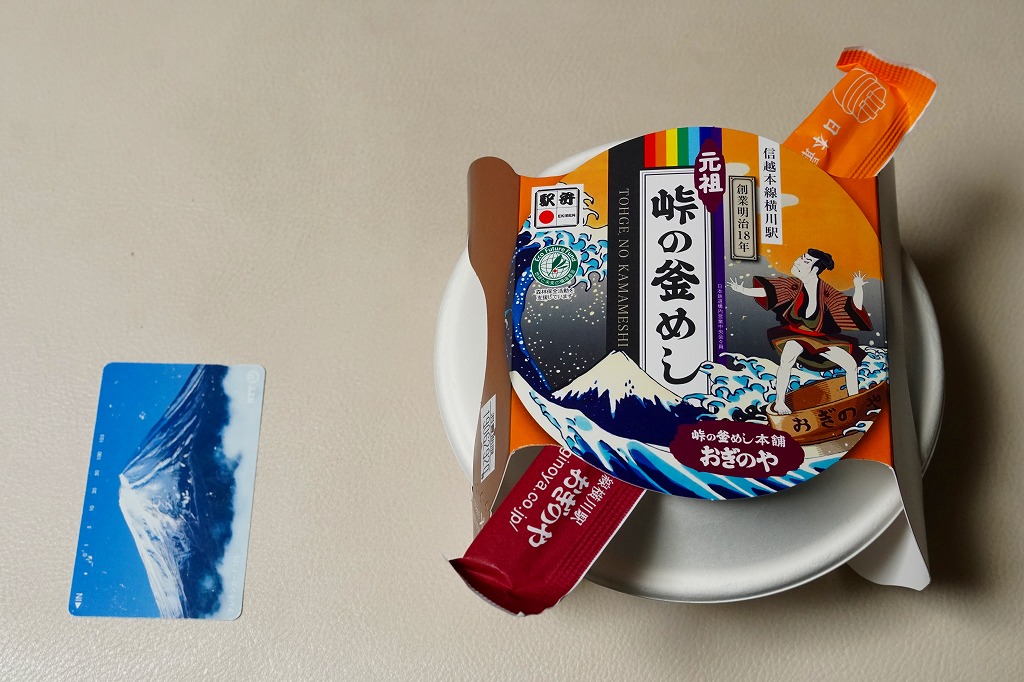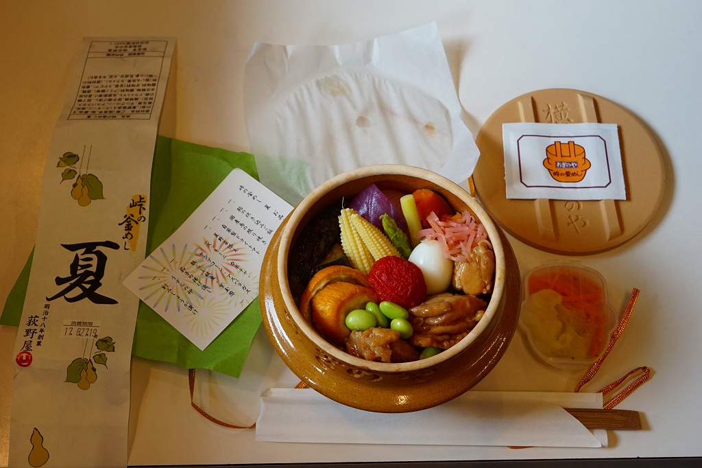 峠の釜めしの販売55周年を記念して、2013(平成25)年の春から横川のドライブインとサービスエリアで売られる商品。四季の変化を織り込んだプレミアムな釜めしという位置付けで、春夏秋冬の4種類を毎年回している。今回買えたのは5年目の「夏」。横川駅弁「峠の釜めし」と同じ益子焼の容器に、おしながきを置き、抹茶色の包装紙を載せて、「夏」と描かれた掛紙を巻く。