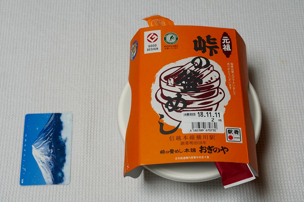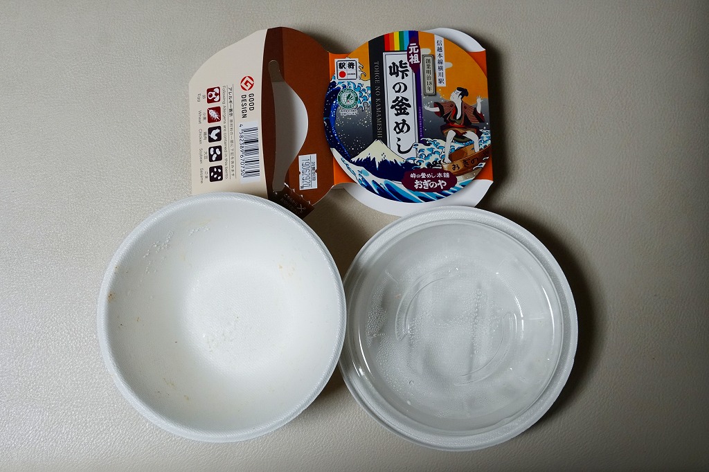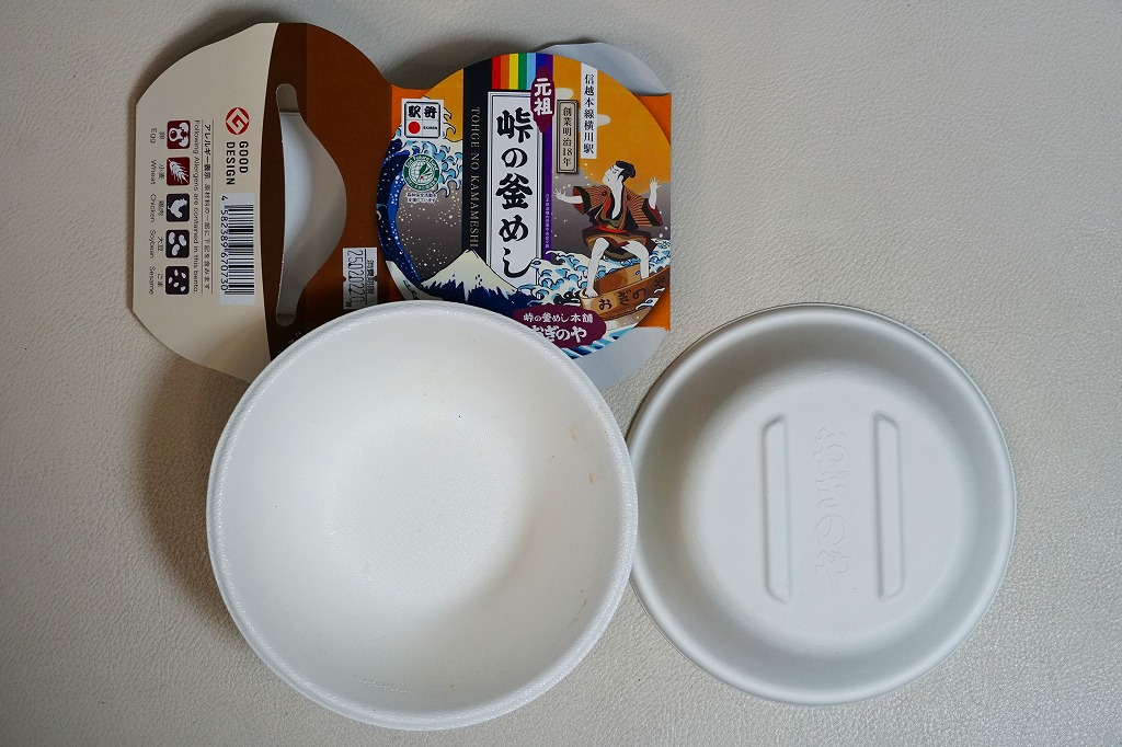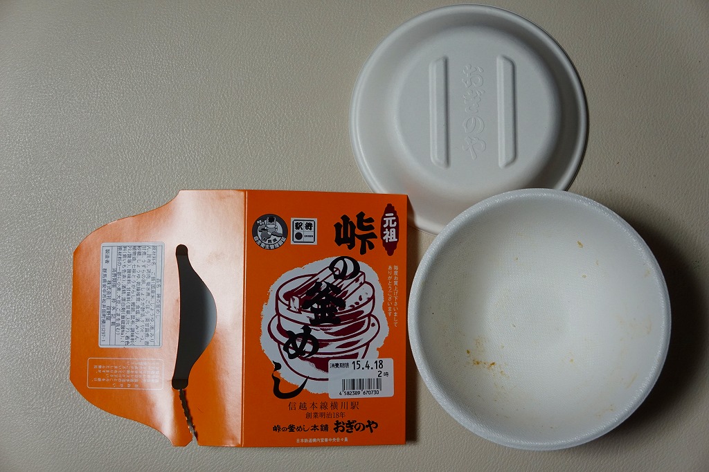 この駅弁のボール紙の枠には『「益子焼の器が重い。」というご意見を受け』制作したとあるが、客の捨て釜が来る鉄道会社と空港管理会社とバスツアー会社を除いて、そんな意見を本気で言う人がいるのだろうか。名物の駅弁と同じ味を当時お徳に食べられた利点と同時に、この駅弁を名物にした大切なものを省いた寂しさを感じた。2017(平成29)年10月のJR東日本の駅弁キャンペーン「駅弁味の陣2017」に、この紙容器版がエントリーされ、峠の釜めしの器が紙になってしまったと、ネット上がざわついた。