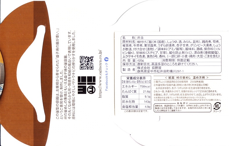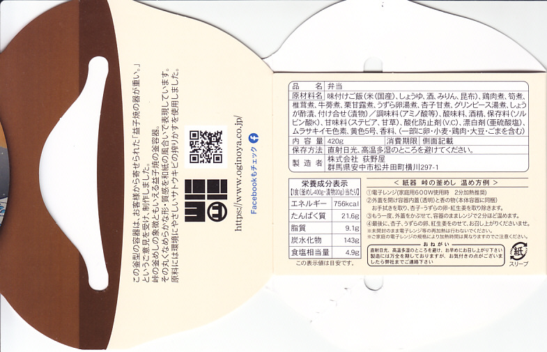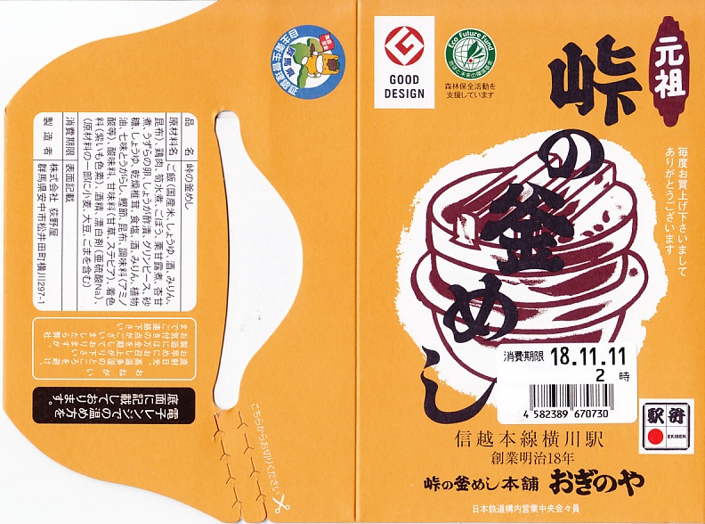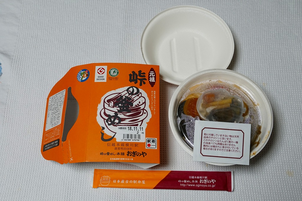 2018(平成30)年11月10日に購入した、横川駅弁のスリーブ。下記の2015年のものと、構造や絵柄は変わらないが、アイコンや注意書きがいろいろ増えている。