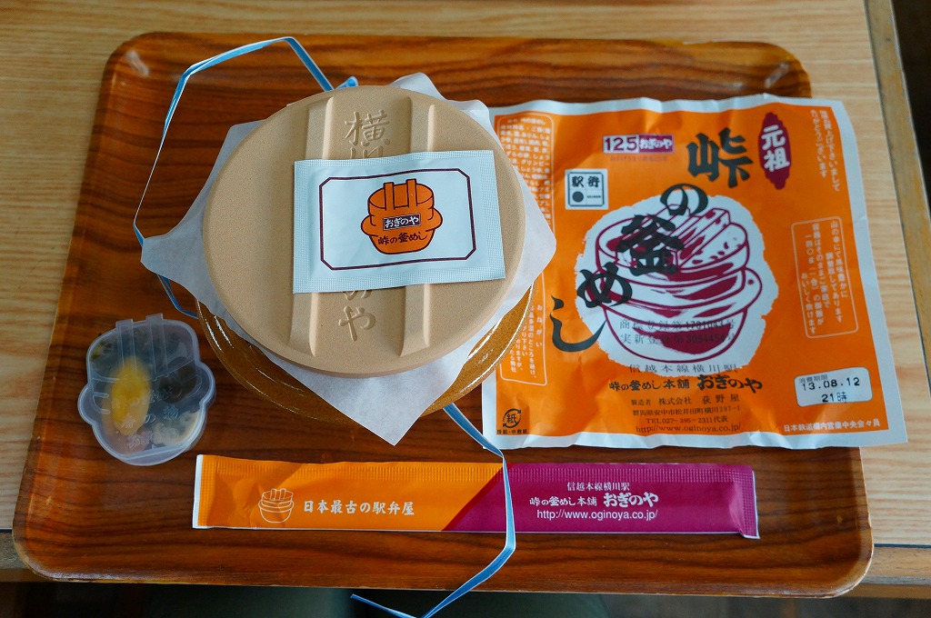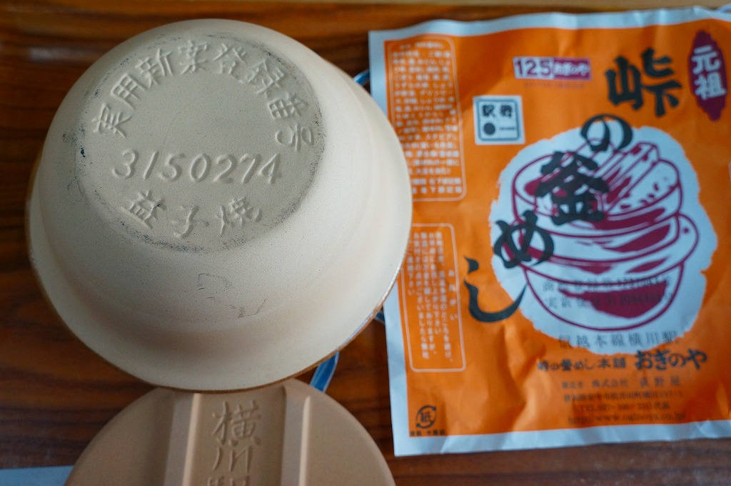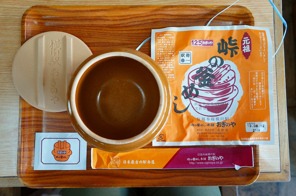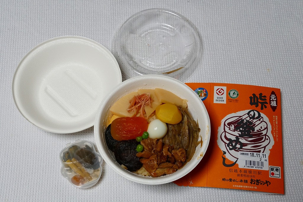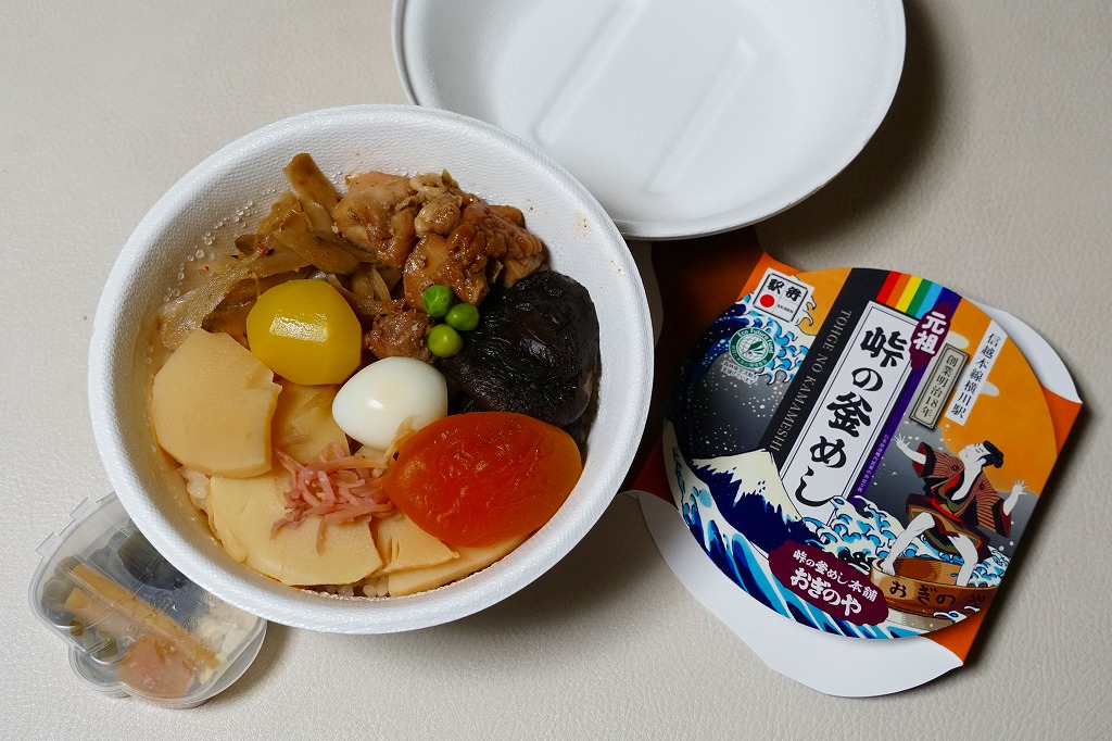 1958(昭和33)年2月に横川駅で発売。その前年の12月に横川駅で非公式に発売したとする文献もある。今さら説明することもない、日本で最も有名な駅弁の一つ。焼き物を容器とした初めての駅弁とされる。益子焼の釜の中に茶飯を詰め、その上に鶏肉、タケノコ、ゴボウささがき、椎茸、栗・、ンズ、うずらの卵、紅生姜、グリーンピースを載せる。ふたも陶製で、掛紙をかけて紙ひもでしばり、釜型プラ製の別容器で5種の漬物を添付して出来上がり。