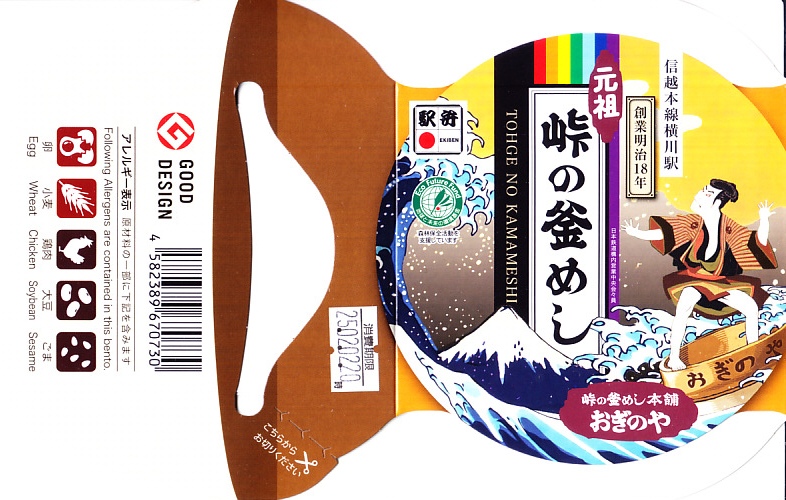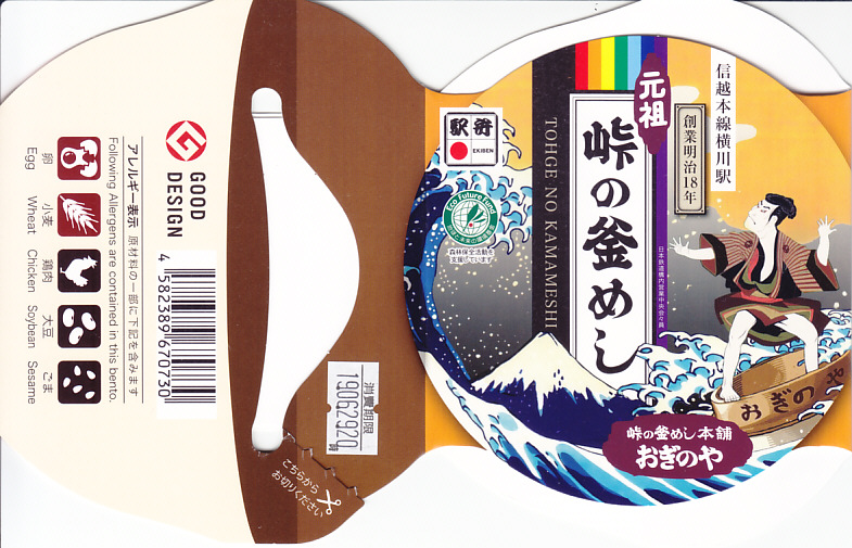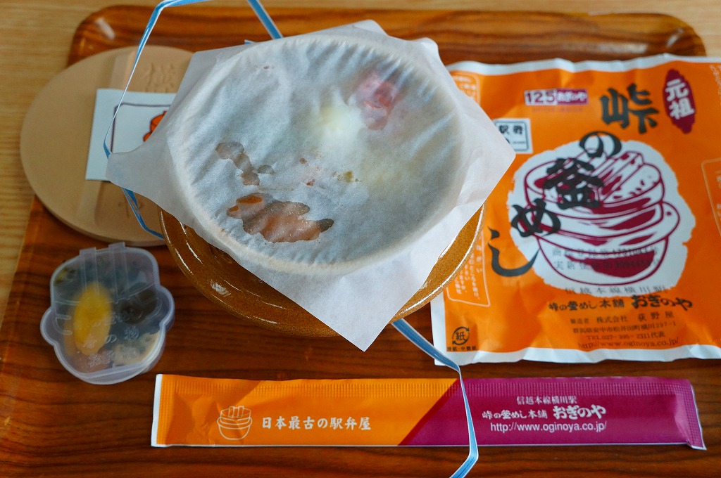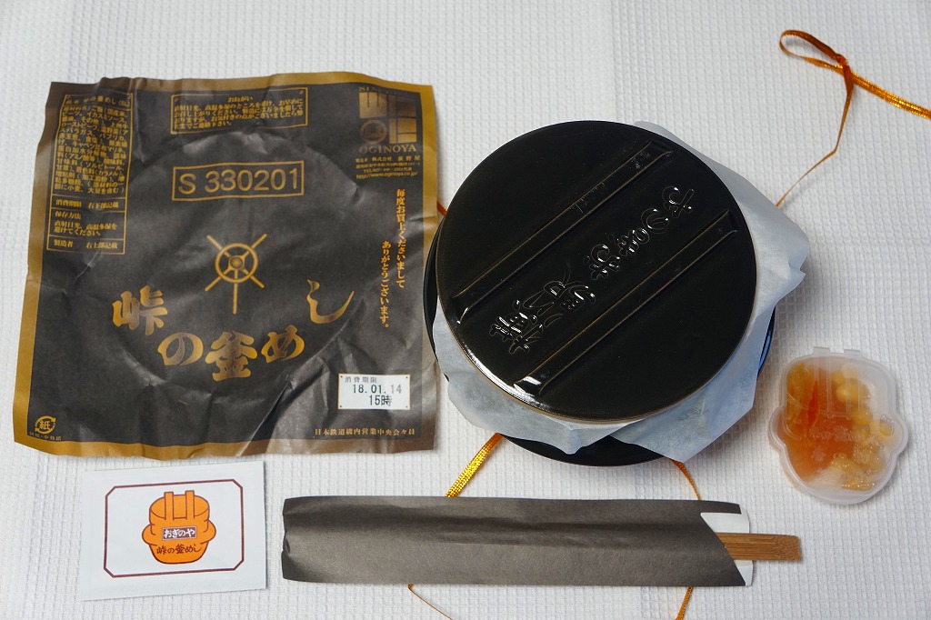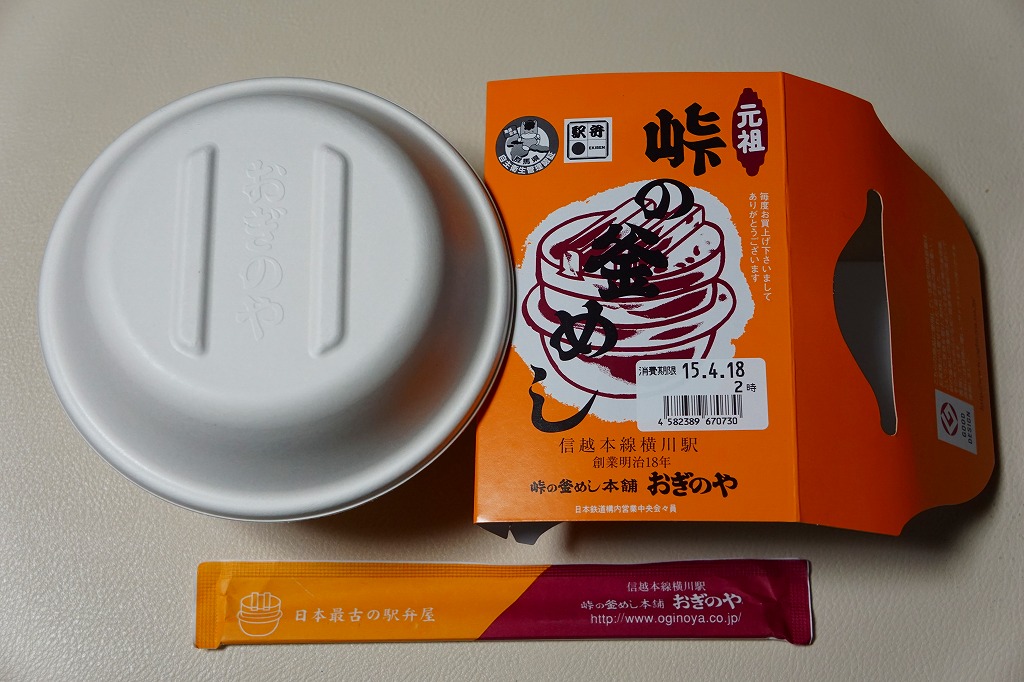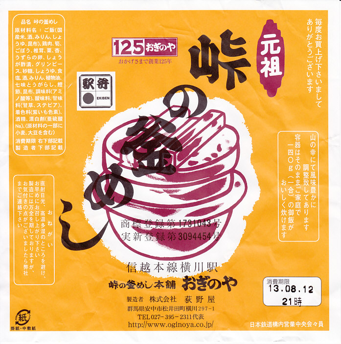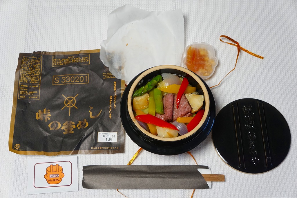 1958(昭和33)年2月に横川駅で発売。その前年の12月に横川駅で非公式に発売したとする文献もある。今さら説明することもない、日本で最も有名な駅弁の一つ。焼き物を容器とした初めての駅弁とされる。益子焼の釜の中に茶飯を詰め、その上に鶏肉、タケノコ、ゴボウささがき、椎茸、栗・、ンズ、うずらの卵、紅生姜、グリーンピースを載せる。ふたも陶製で、掛紙をかけて紙ひもでしばり、釜型プラ製の別容器で5種の漬物を添付して出来上がり。
