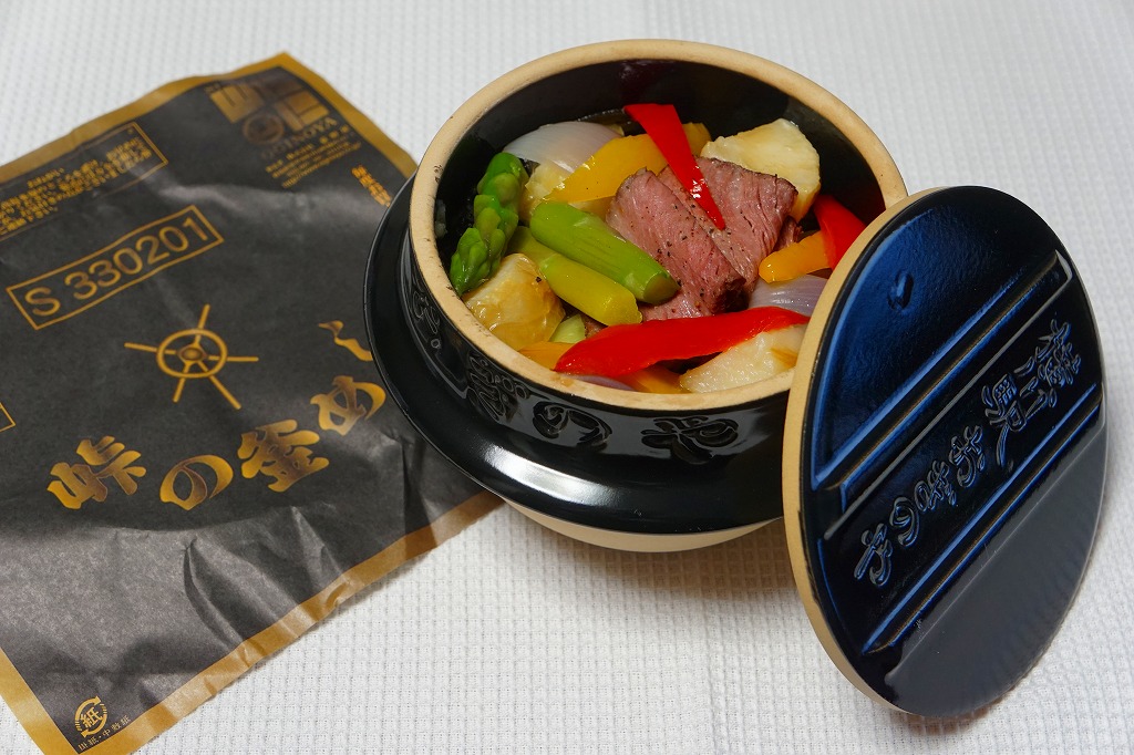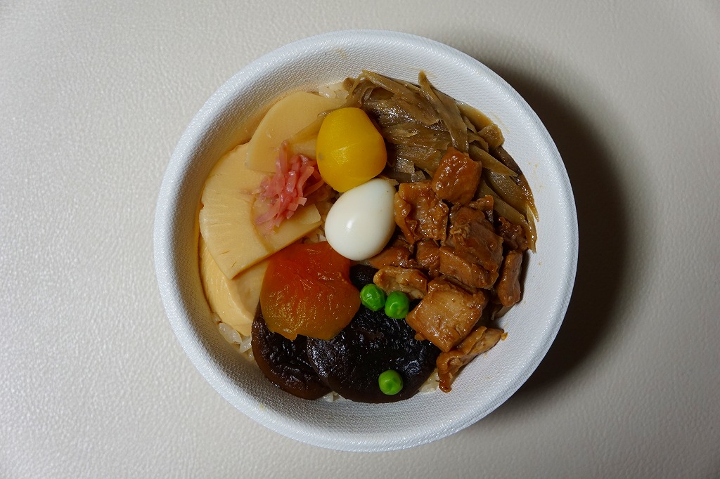 中身は横川のドライブインやサービスエリアで売られる季節の釜飯に似る。イカスミの黒飯を、ローストビーフと、SLの火室の色彩を取り入れたアスパラやパプリカやカブなどの野菜炒めで覆う。普段は漬物を入れるプラ容器には、アンズと煮豆を入れた。温かく暖かい峠の釜めしとは正反対の、クールで明るい味。