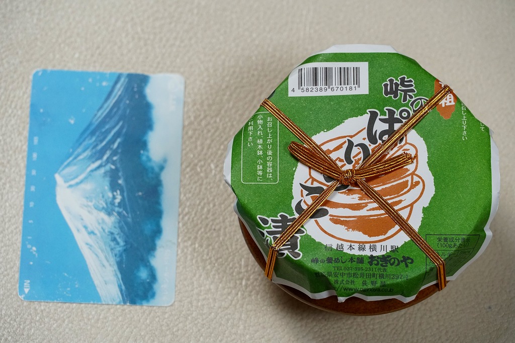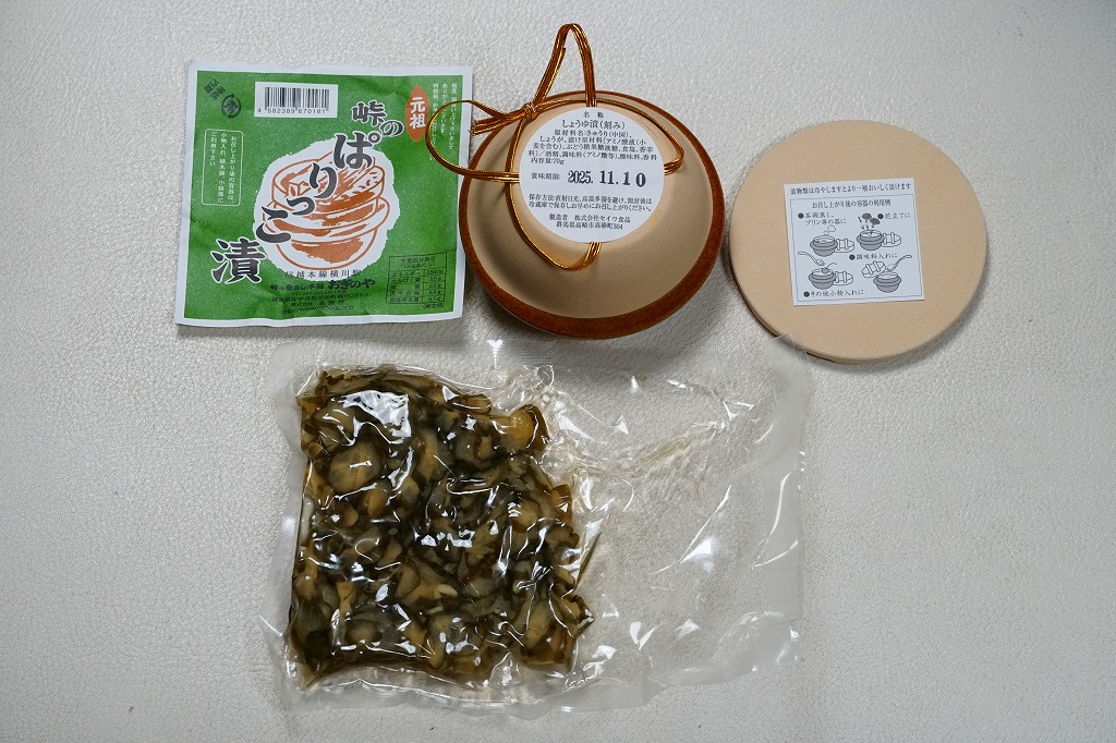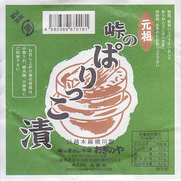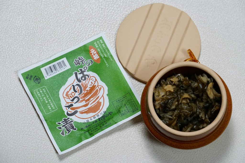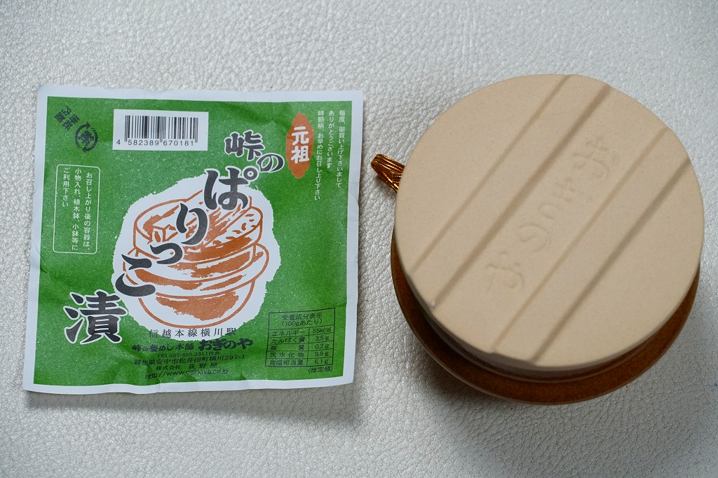 2012(平成24)年か2015(平成27)年までには、調製元のドライブインなどで発売か。横川駅弁「峠の釜めし」の容器を小さくした益子焼に、きゅうり漬けの真空パックを押し込み、峠の釜めしと同じ絵柄で緑色の小さな掛紙をかける。峠の釜めしに添付される香の物5種類のうちひとつである、刻んだキュウリの醤油漬け「峠のぱりっこ漬」の単品販売。土産物店やスーパーでの漬物の袋売りでよいところを、こんな容器に詰めるところがかわいらしい。今回はなんと大阪の駅弁売店で購入。4か月以上の日持ちがする商品とはいえ、そんな遠隔地にもこの漬物のファンがいるということか。