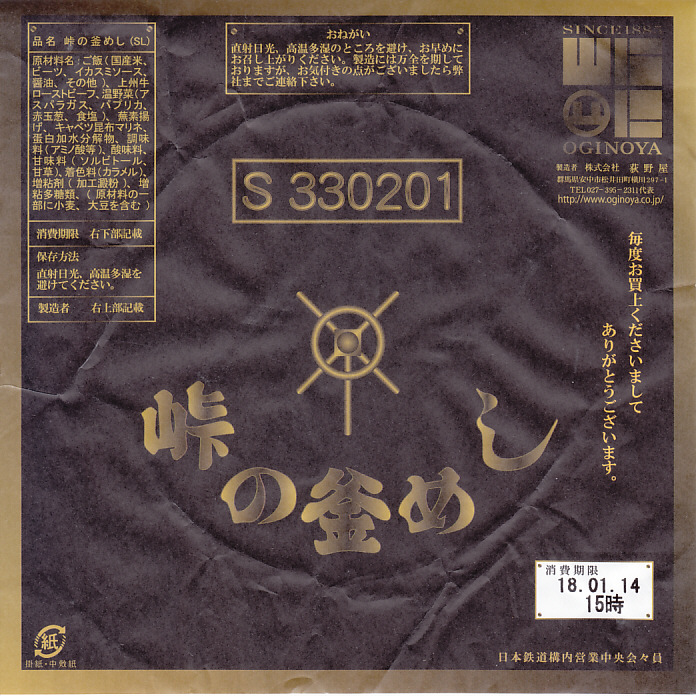 高崎でのSL列車の運行にちなんで、2014(平成26)年5月3日に高崎駅で発売。7月までの販売予定が、その後も時々出現している。著名な駅弁「峠の釜めし」の益子焼の容器を真っ黒に塗り、掛紙も蒸気機関車の車体色と同じく真っ黒。その不思議な車番「S330201」は、峠の釜めしが昭和(S)33年02月01日に発売されたことにちなむ。