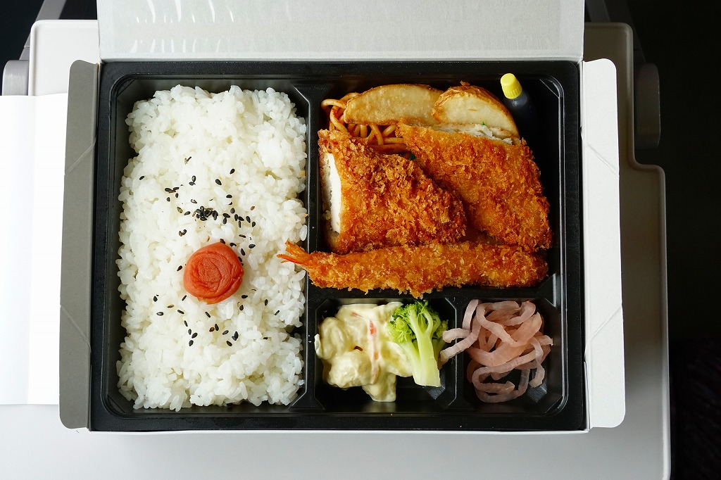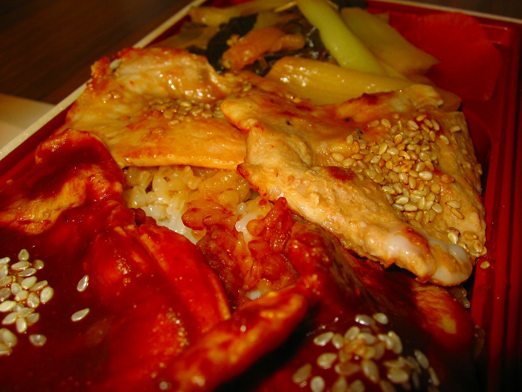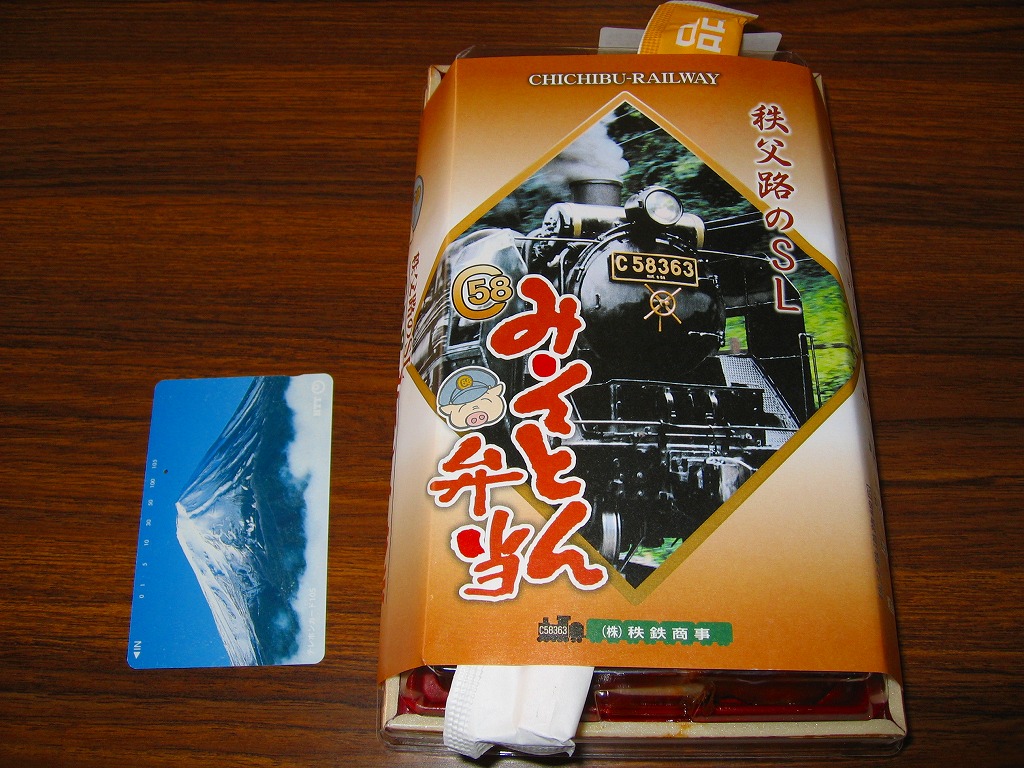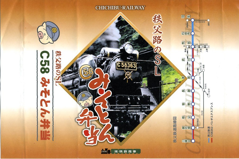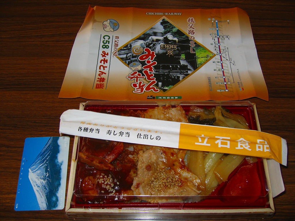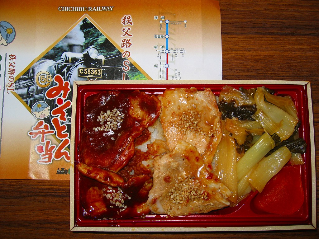 発泡材枠にトレーを接着した長方形の容器に透明なフタをして、蒸気機関車の顔の写真を載せた掛紙で割りばしごと容器を巻いて、セロテープで留める。中身は白味噌焼き豚肉と赤味噌焼き豚肉と、秩父地方の家庭で使われるというしゃくし菜の油炒めを白御飯の上に貼り付ける豚丼。インパクトと風味は並だが、埼玉県の駅弁というだけで希少価値がある。この弁当は2012年までの販売か。