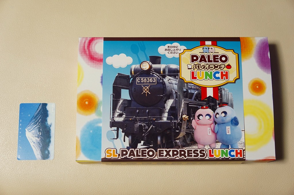 上記の車内弁当「SLパレオランチ」の、2016(平成28)年時点での姿。紙容器は同じで、掛紙の絵柄が異なる。中身は似ているようで同じでなく、白御飯にSL形の海苔と太陽の梅干を載せ、トンカツ、エビフライ、ウインナー、焼き鮭、煮玉子、ポテトサラダ、スパゲティ、ミニハンバーグ、ごぼう、カップゼリーなどを詰める、少し大人の味を持つお子様ランチだった。