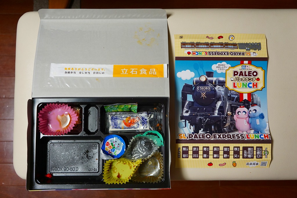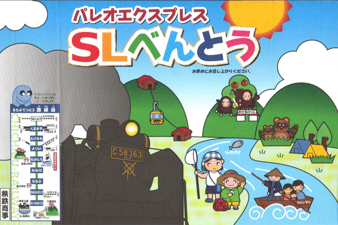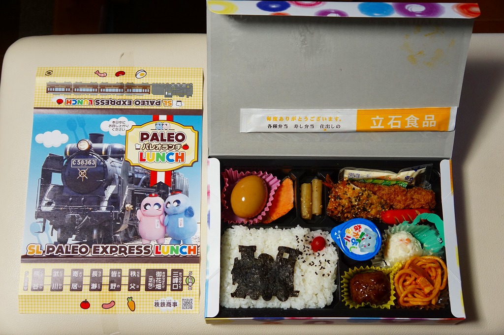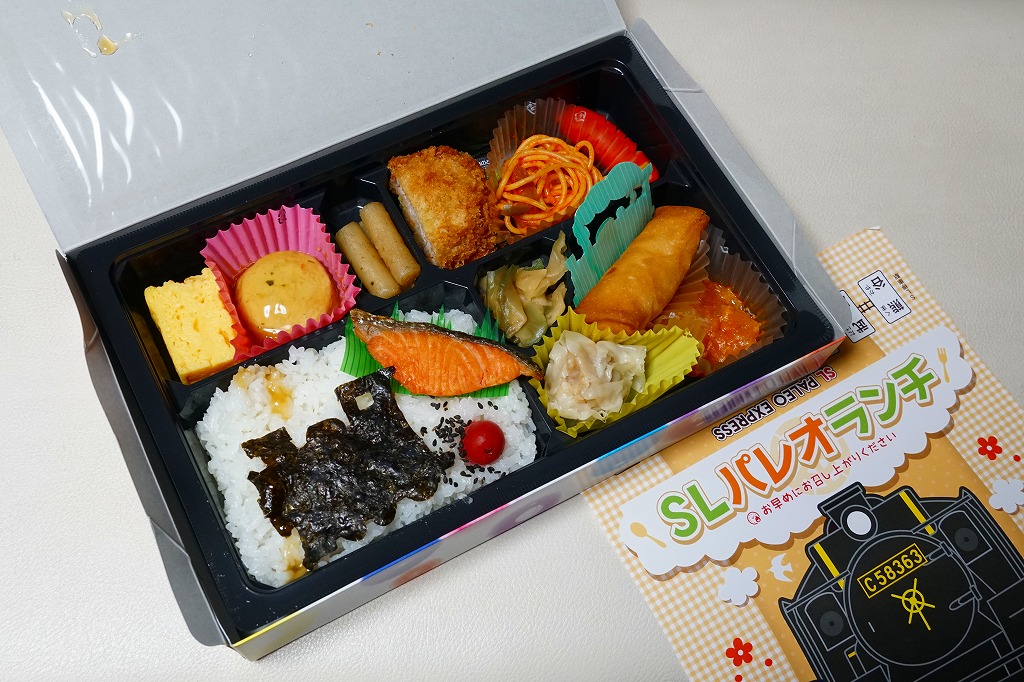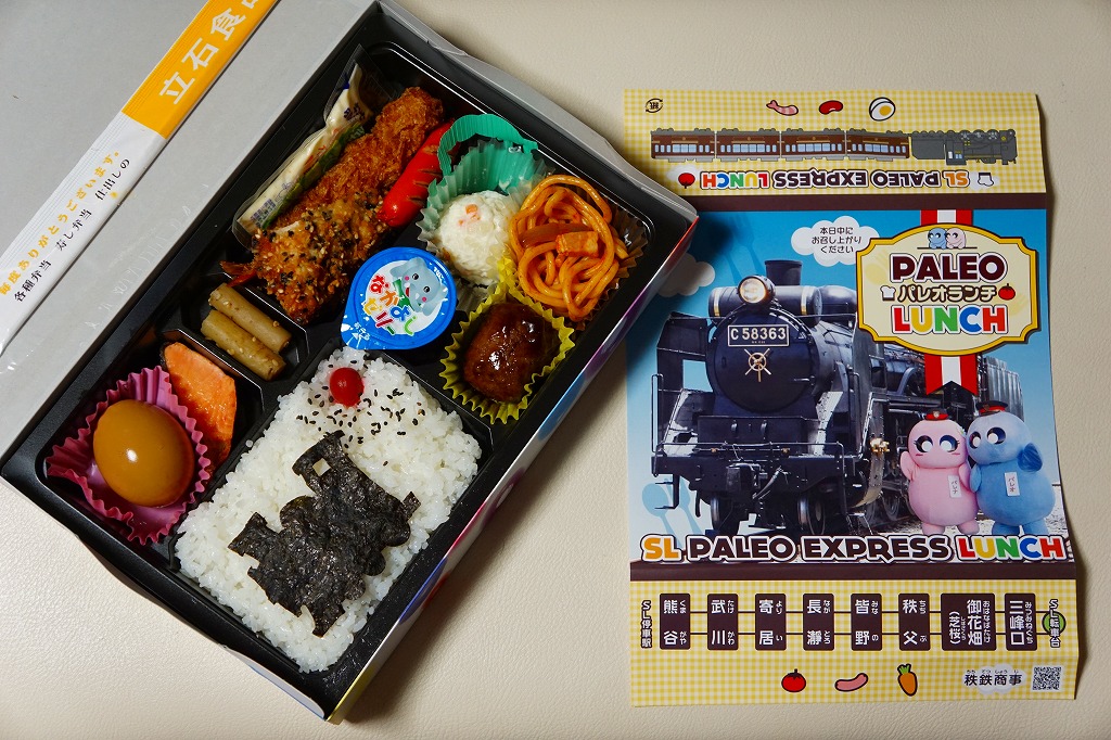 秩父鉄道のSL列車「SLパレオエクスプレス」の車内で販売されるお弁当。市販のボール紙の製惣菜弁当容器に、蒸気機関車の写真と、SL列車の編成図や停車駅やキャラクターを描いた掛紙を巻く。中身は白御飯にSL形の海苔と梅干しと焼鮭を載せ、海老チリと焼売と春巻きとザーサイ、トンカツとスパゲティとウインナー、ごぼうとがんもどきと玉子焼。意図したのかどうか、御飯と中華と洋風と和風の詰合せにも見える。お子様ランチでも惣菜でも駅弁でもないような、中間的な内容と風味。