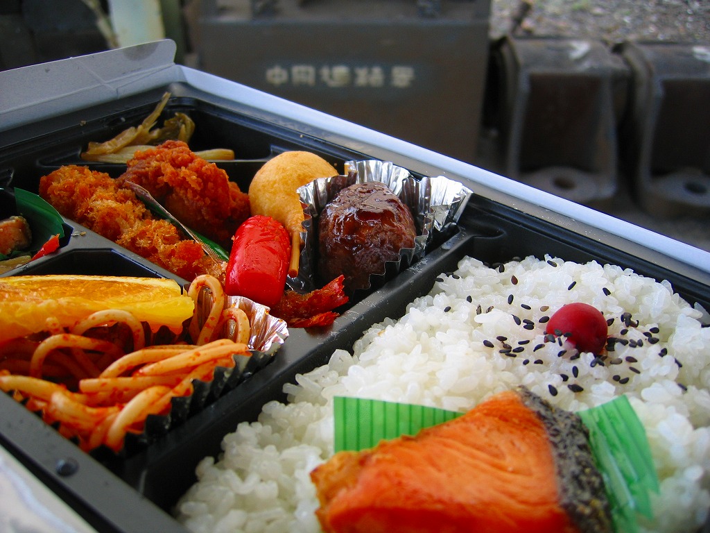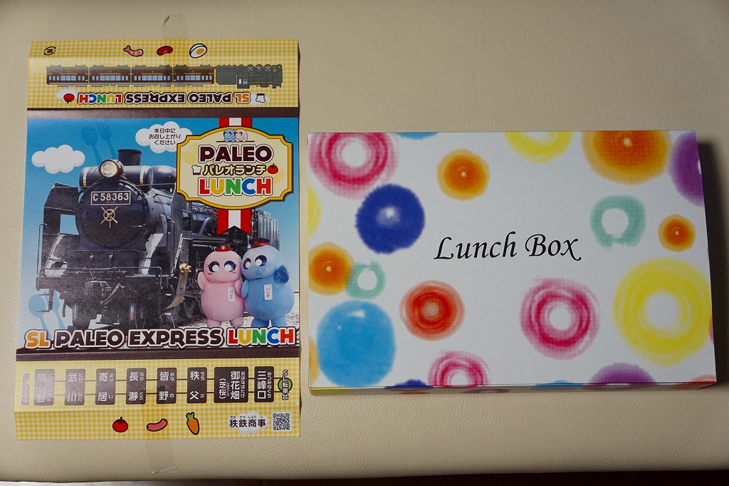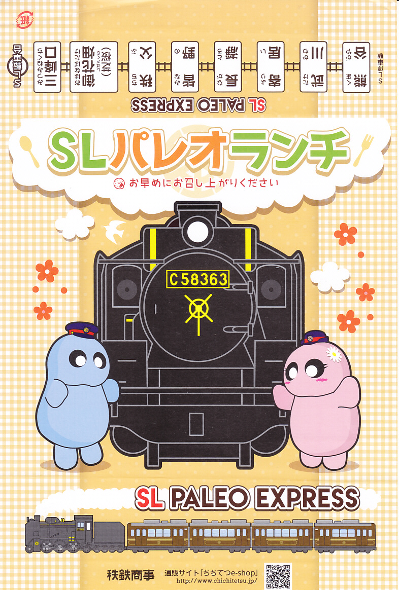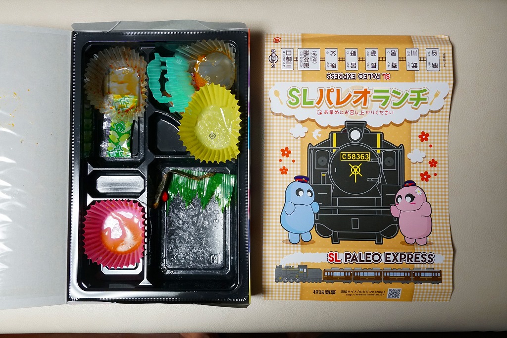 秩父鉄道のSL列車「SLパレオエクスプレス」の車内で販売されるお弁当。市販のボール紙の製惣菜弁当容器に、蒸気機関車の写真と、SL列車の編成図や停車駅やキャラクターを描いた掛紙を巻く。中身は白御飯にSL形の海苔と梅干しと焼鮭を載せ、海老チリと焼売と春巻きとザーサイ、トンカツとスパゲティとウインナー、ごぼうとがんもどきと玉子焼。意図したのかどうか、御飯と中華と洋風と和風の詰合せにも見える。お子様ランチでも惣菜でも駅弁でもないような、中間的な内容と風味。