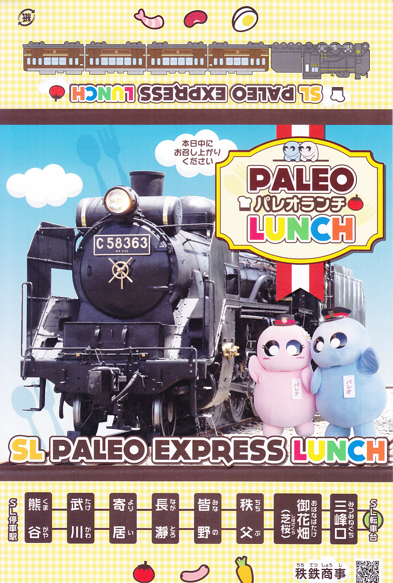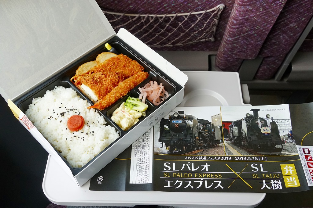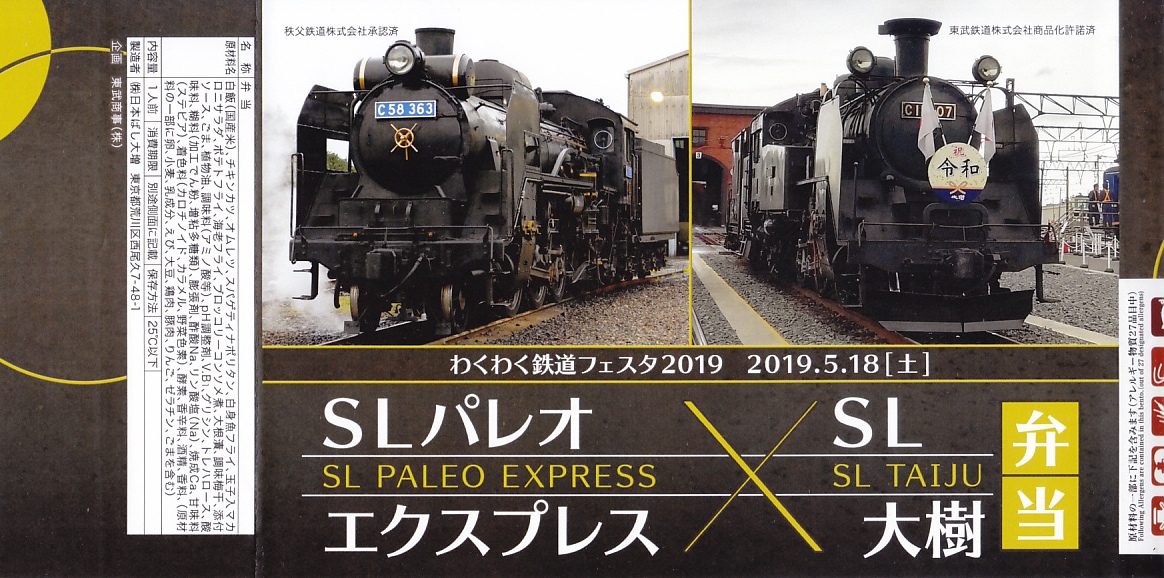 2019(令和元)年5月18日に秩父鉄道の広瀬川原車両基地で開催されたイベント「わくわく鉄道フェスタ2019」で販売されたお弁当。市販の仕出し弁当向けボール紙製容器に巻かれた掛紙には、秩父鉄道のSL列車「SLパレオエクスプレス」に使用されるC58363蒸気機関車と、東武鉄道のSL列車「SL大樹(たいじゅ)」に使われるC11207蒸気機関車の写真と列車名が記載される。