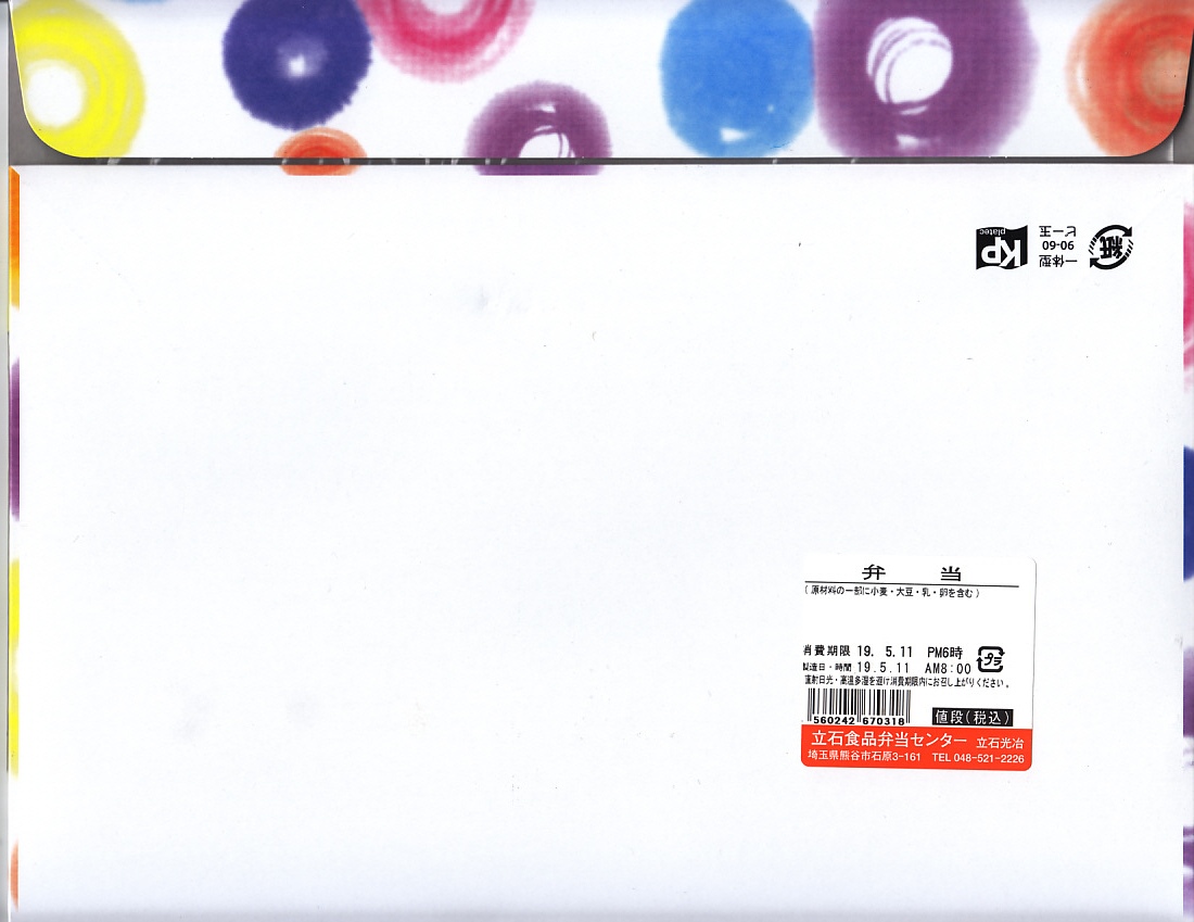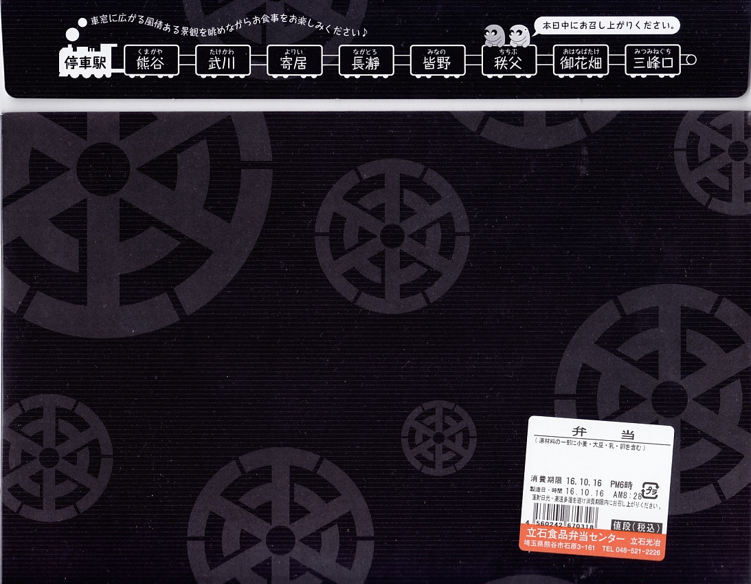 2019(令和元)年5月11日に購入した、秩父駅弁の掛紙。2か月前と変わらない。同月の改元に伴い、製造年月日と消費期限の印を、和暦から西暦に変えたことが分かる。