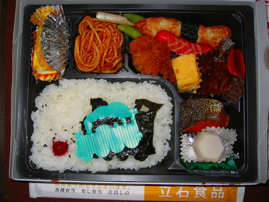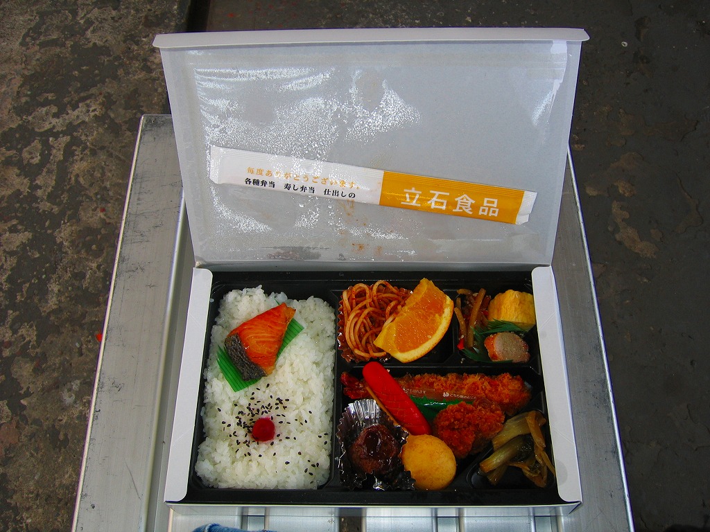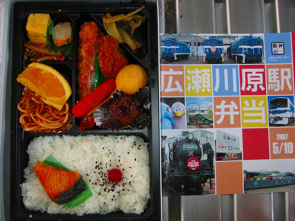 2005(平成17)年から毎年1回実施される、秩父鉄道の工場公開「わくわく鉄道フェスタ」の会場で売られる「駅弁」。ボール紙製の市販惣菜弁当容器に、イベント告知ポスターと意匠を合わせた、前年のイベント風景の写真を7点散りばめた大きな掛紙をかけて、セロハンテープで留める。今回の中身は日の丸御飯に鶏唐揚、エビフライ、肉団子、ホットドッグ、ウインナー、スパゲティ、きんぴらごぼう、玉子焼、焼たらこ、オレンジなどで、小学生にも向く洋食弁当。分量はたっぷり、味はしっかり。1日限り、500個限りの記念弁当なのに、掛紙も立派に刷られている。