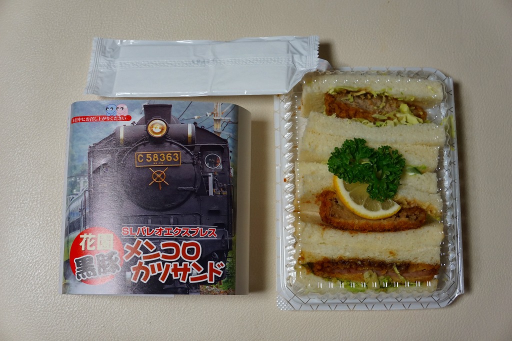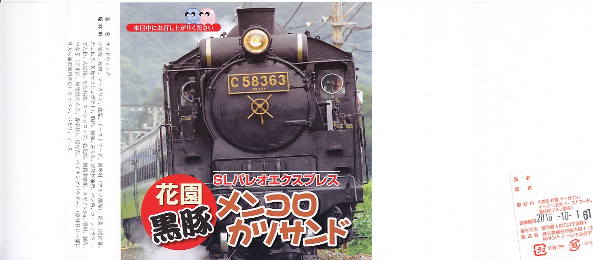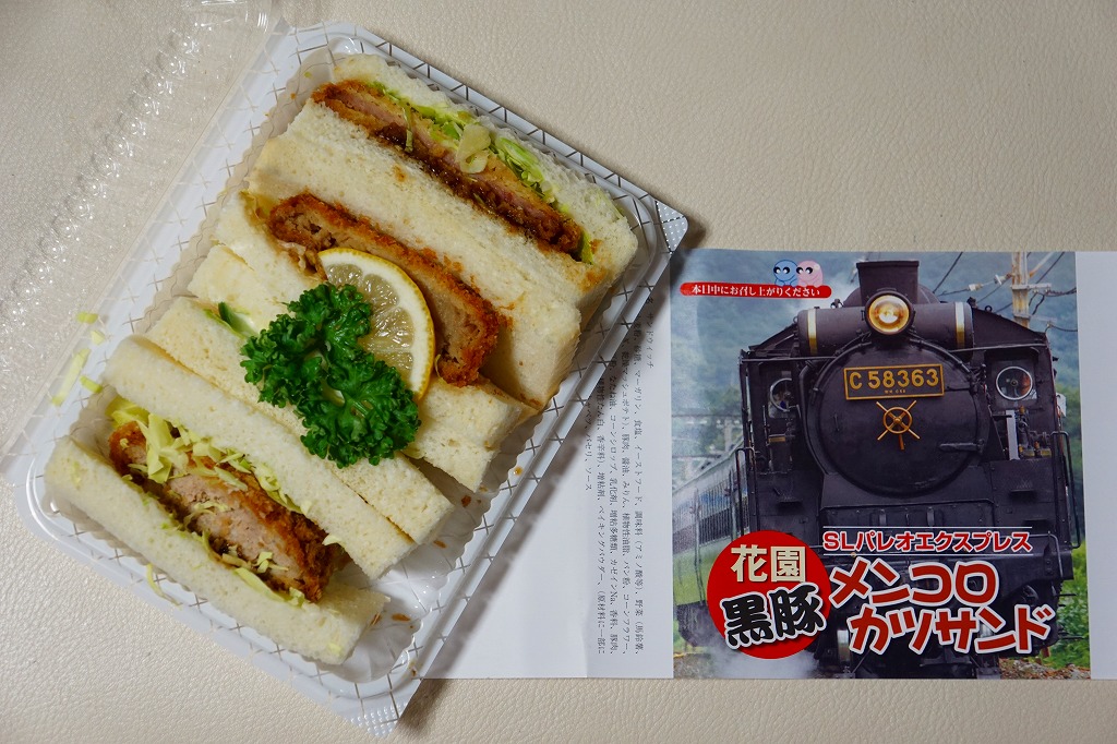 秩父鉄道のSL列車「SLパレオエクスプレス」の車内販売で、2013(平成25)年の運転シーズンからの発売か。SLパレオエクスプレスの走行写真の掛紙を巻いた、市販のサンドイッチ向けプラ製の惣菜容器の中に、埼玉県深谷市の銘柄豚「花園黒豚」を使う、「メン」チカツや「コロ」ッケやハム「カツ」のサンドイッチを収める。
