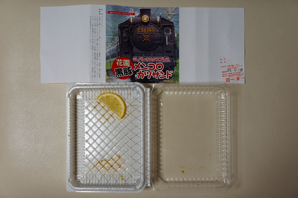 いずれの具も柔らかい味と香りと口当たりを持つが、ここまでは見た目も内容も普通の惣菜サンド。この商品は、透明なふたを開けるとパンとマーガリンが香り、食べるとパン生地にほのかな甘さを感じた。こんな体験は、駅弁でも惣菜でも初めて。調製元は熊谷市内のパン屋さん。2019年時点でこの商品のSL車内での存在を確認できていない。