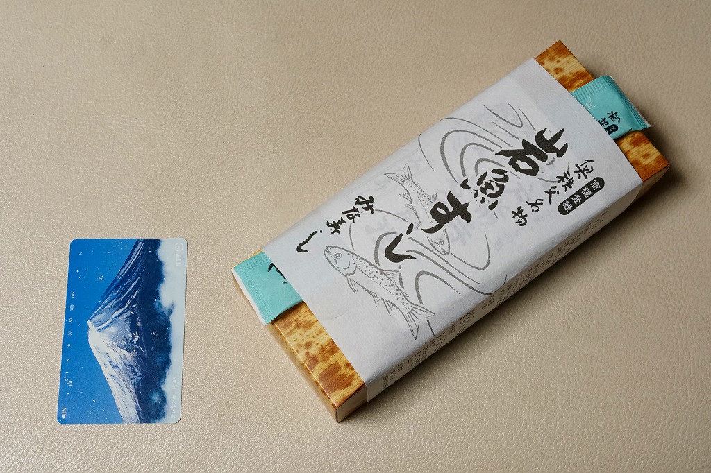 竹皮柄のボール紙容器に、イワナに白板昆布をかけた押寿司を1本入れ、商品名と魚と流れを描いた掛紙を巻く。駅弁ではなく土産物だが、駅弁のような商品。少々の塩気を持つ、身も飯も味もやわらか。価格は2018年時点で980円、2019年10月時点で1,080円、2023年時点で1,480円。