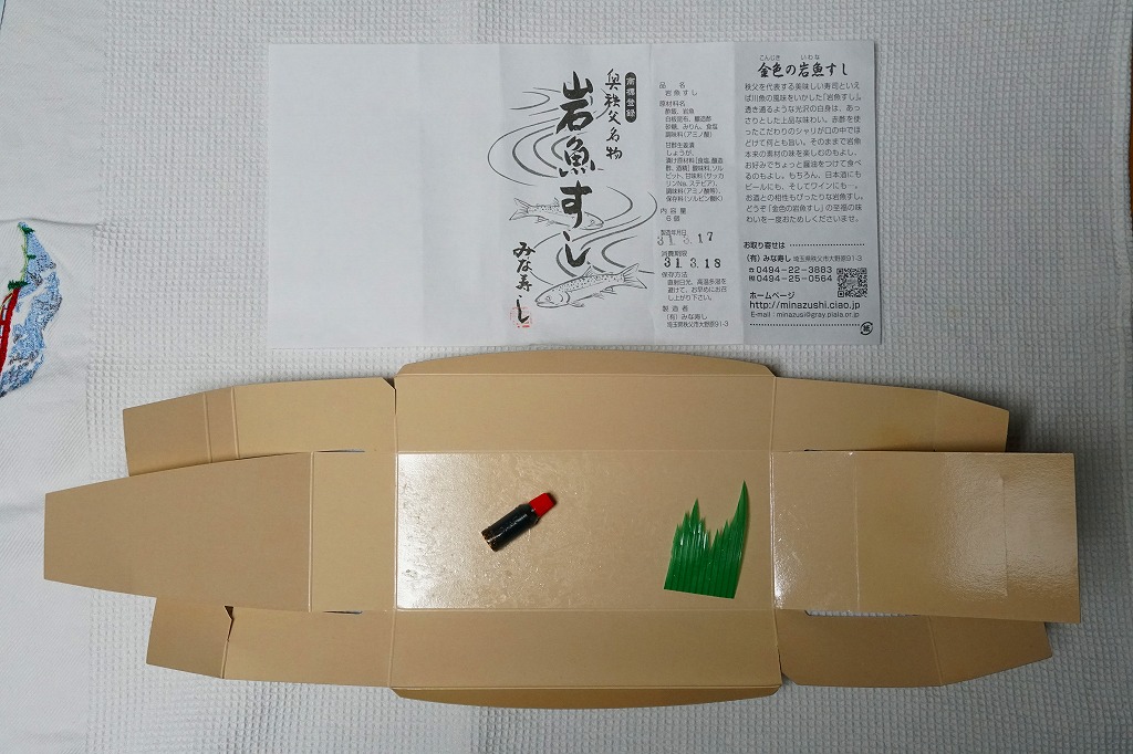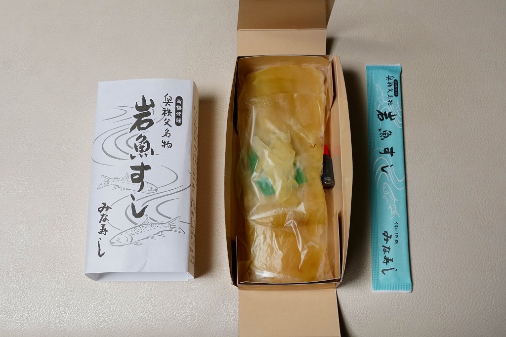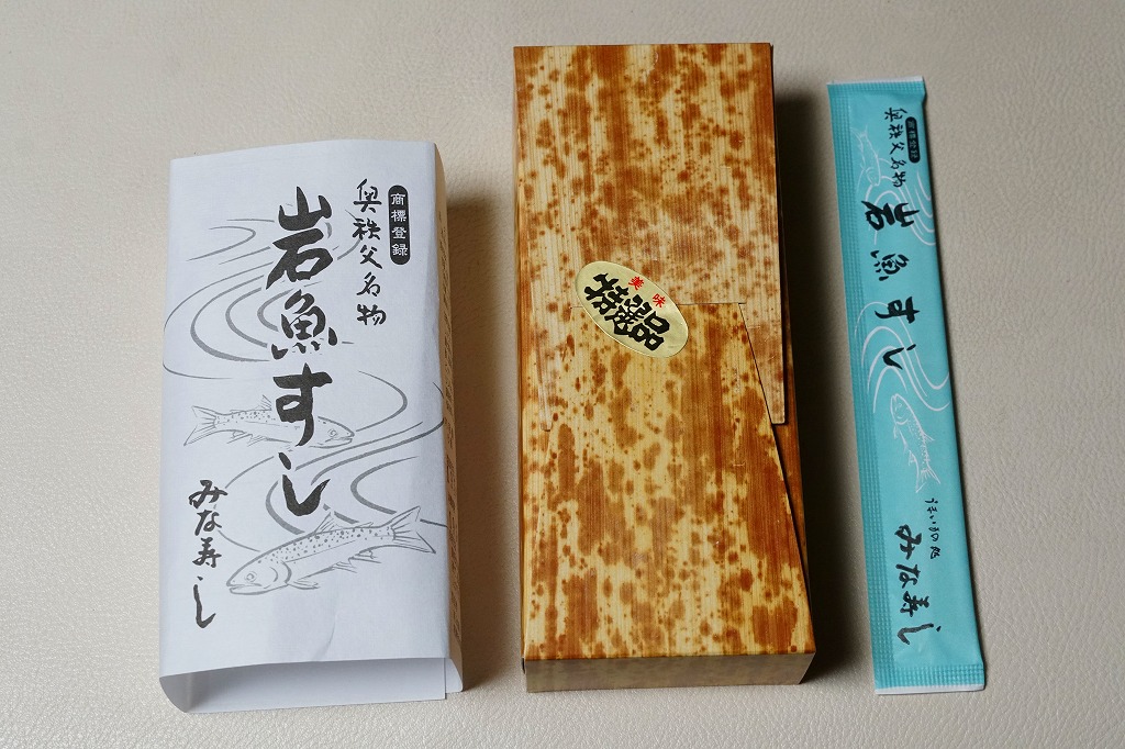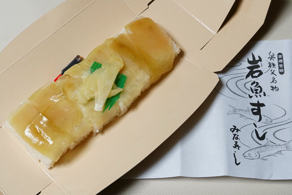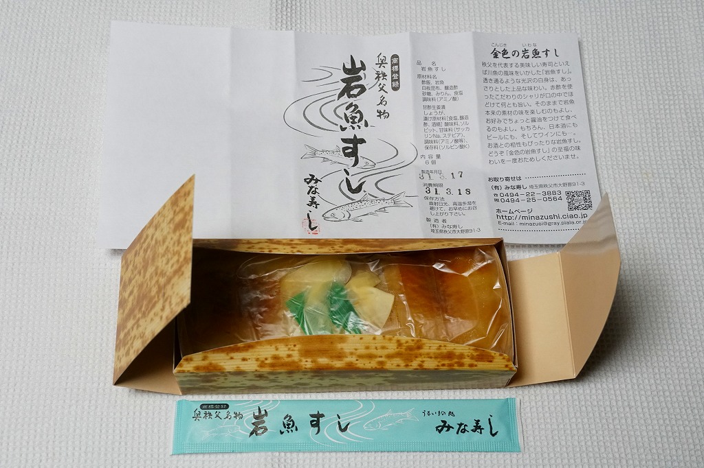 以前から秩父駅の土産物店で見掛けていた、イワナの押し寿司。2017(平成29)年4月の西武秩父駅のリニューアルで、同駅の土産物店にも置かれるようになり、まれに同駅の駅弁と紹介される記事が出る。もとは道の駅の商品で、2001(平成13)年7月の道の駅ちちぶのオープンに合わせて作られたのだそうな。