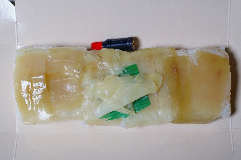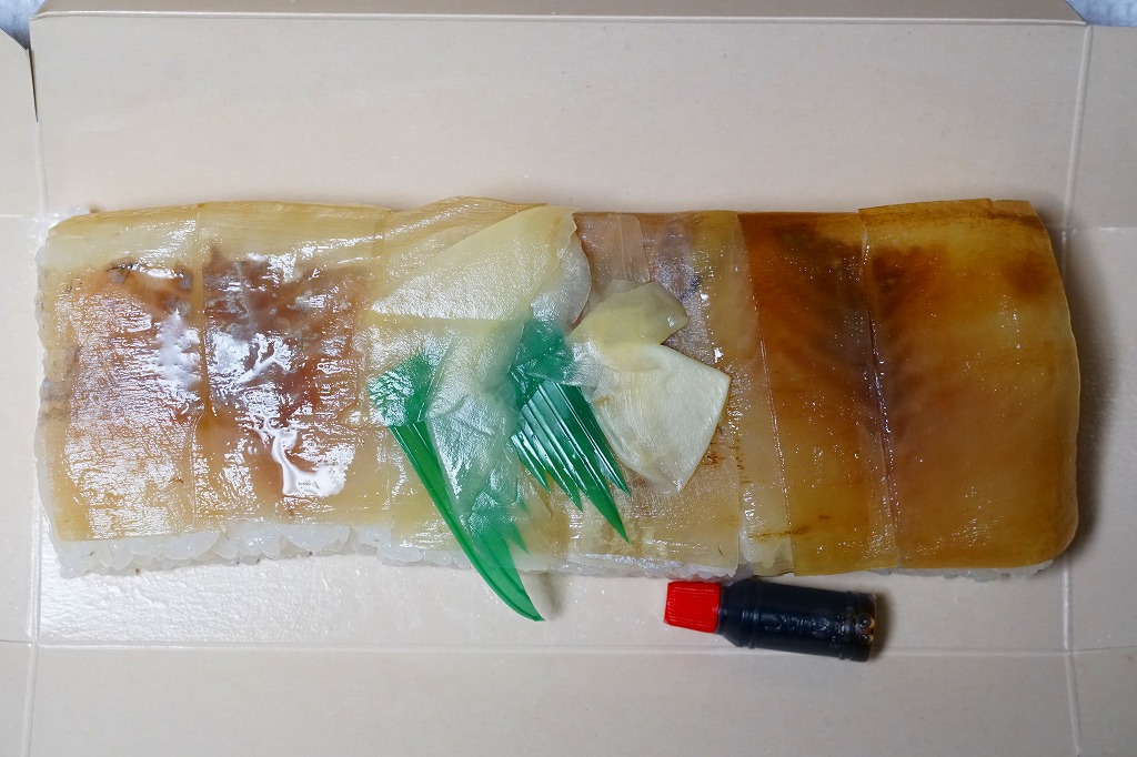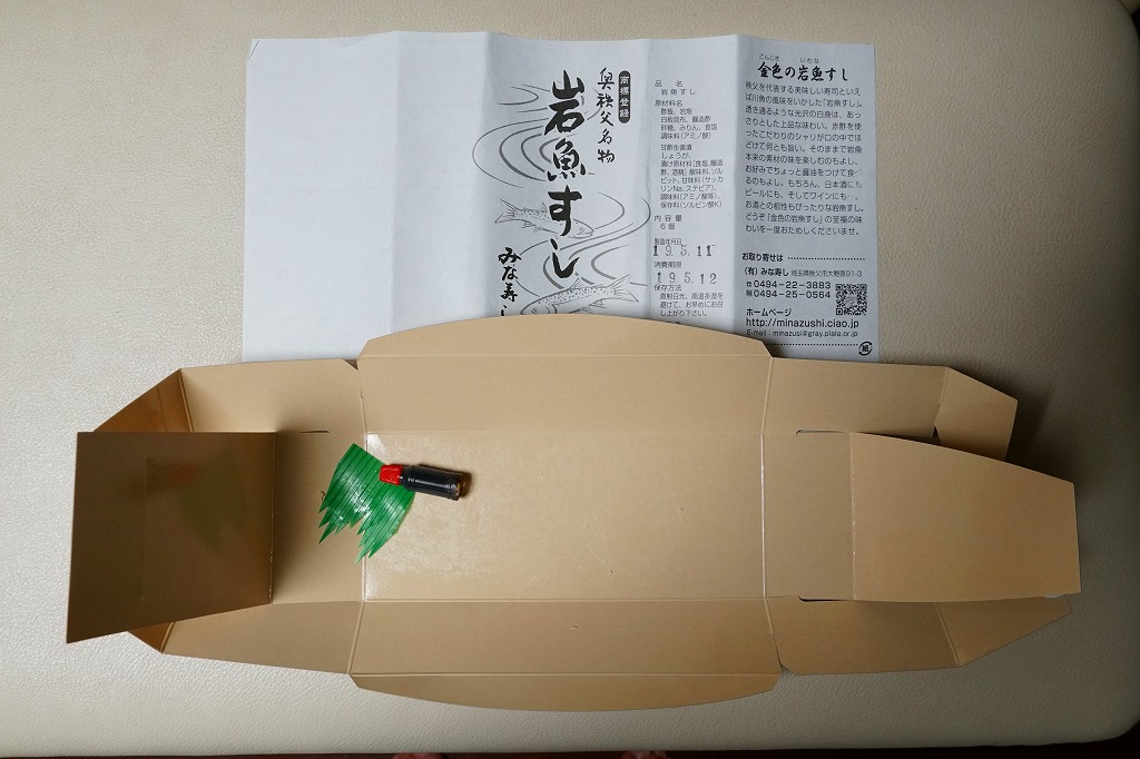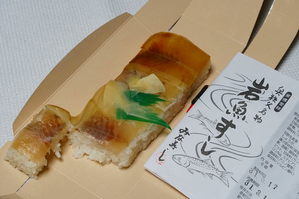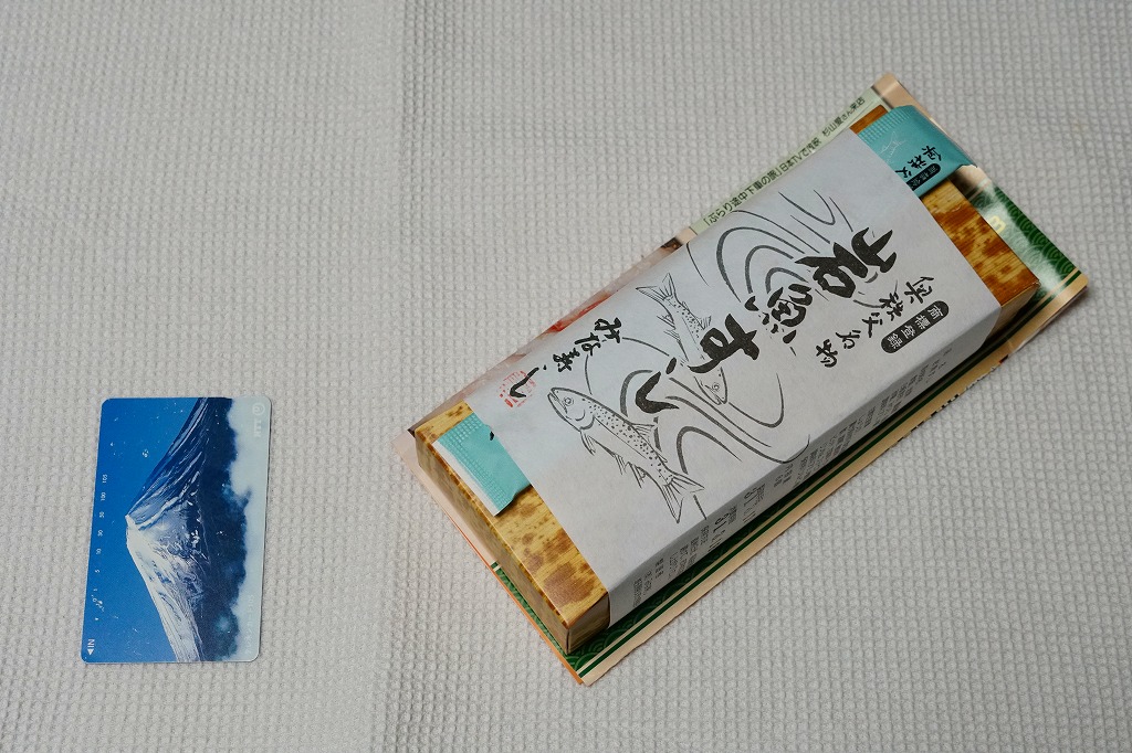 以前から秩父駅の土産物店で見掛けていた、イワナの押し寿司。2017(平成29)年4月の西武秩父駅のリニューアルで、同駅の土産物店にも置かれるようになり、まれに同駅の駅弁と紹介される記事が出る。もとは道の駅の商品で、2001(平成13)年7月の道の駅ちちぶのオープンに合わせて作られたのだそうな。