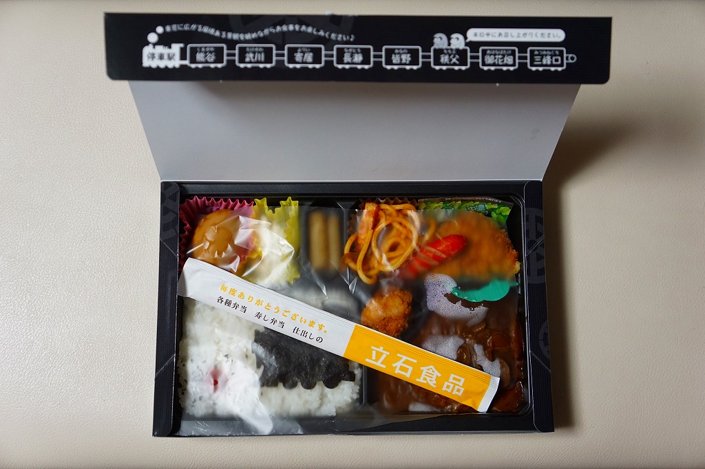 中身は調製元の注文販売弁当をアレンジしたようなもので、ふりかけ茶飯にポテトコロッケ、エビフライ、豚生姜焼、スパゲティ、ポテトサラダ、ブロッコリー、大根漬など。中身に秩父や東武のものは何もない。