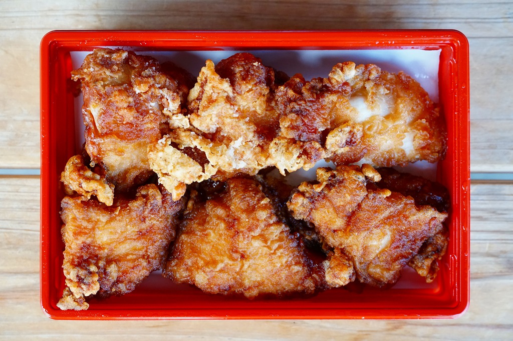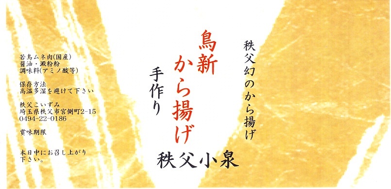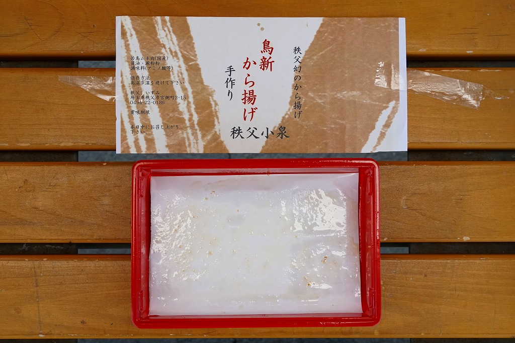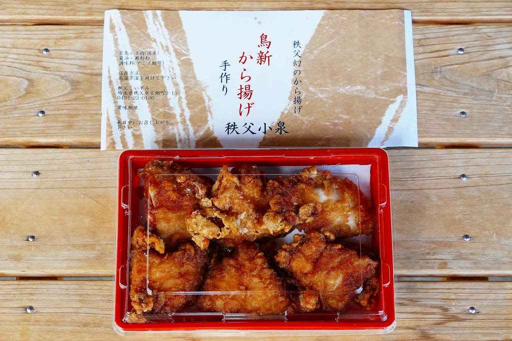 上記の弁当「復刻鳥新弁当」とともに購入。弁当に入る鶏唐揚だけが6個で550円。惣菜の販売には無用な掛紙を巻いていて、まるで駅弁のようにみえた。ぷりぷりの鶏肉に、油たっぷりの衣。掛紙に「秩父幻のから揚げ」の表記があり、そういうキャラクターなのだろう。