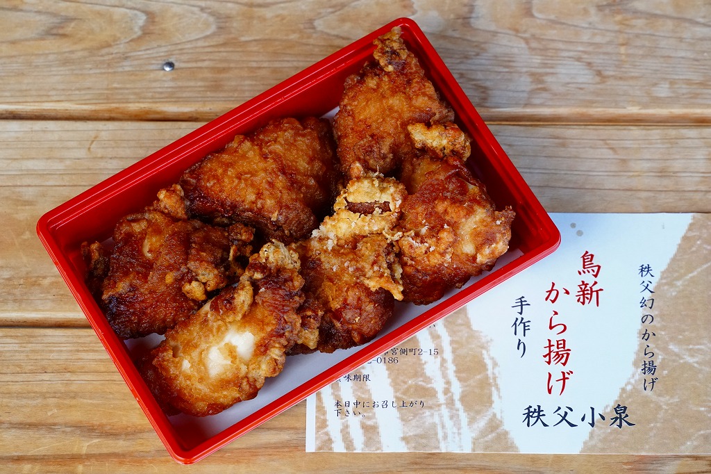 秩父駅では2020(令和2)年4月までに発売か。秩父駅が入居するビル「秩父市地場産業センター」の1階店舗「ははそ食堂」、のち2022年3月のリニューアルで「じばさん商店」内の売店「縁むすび」の、店頭で売られるお弁当。秩父市街で2017年限りで閉店した鳥料理店「鳥新」の弁当が、翌2018年に秩父地域おもてなし観光公社の監修で復刻され、駅裏の仕出し料理店「こいずみ」の調製により売られるようになった。鉄道会社も店舗も調製元も駅弁とは紹介しない、そもそもこの商品自体を紹介しないが、駅に来た駅弁ファンが、これは秩父駅の駅弁だと感じて買っていく。売り場には「秩父の駅弁」の掲示もあった。