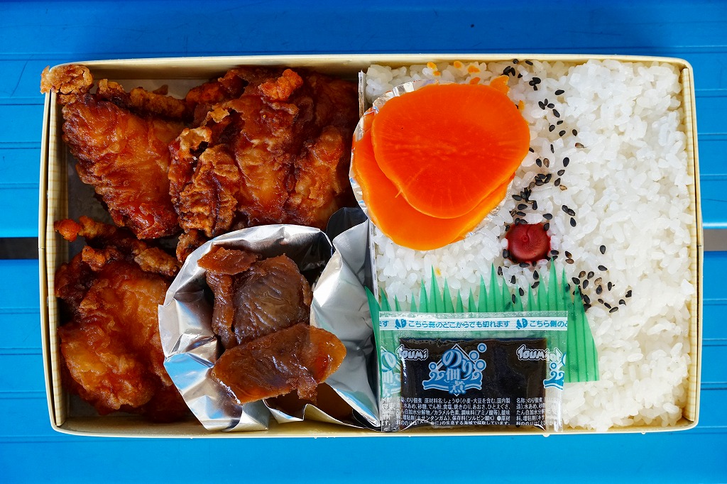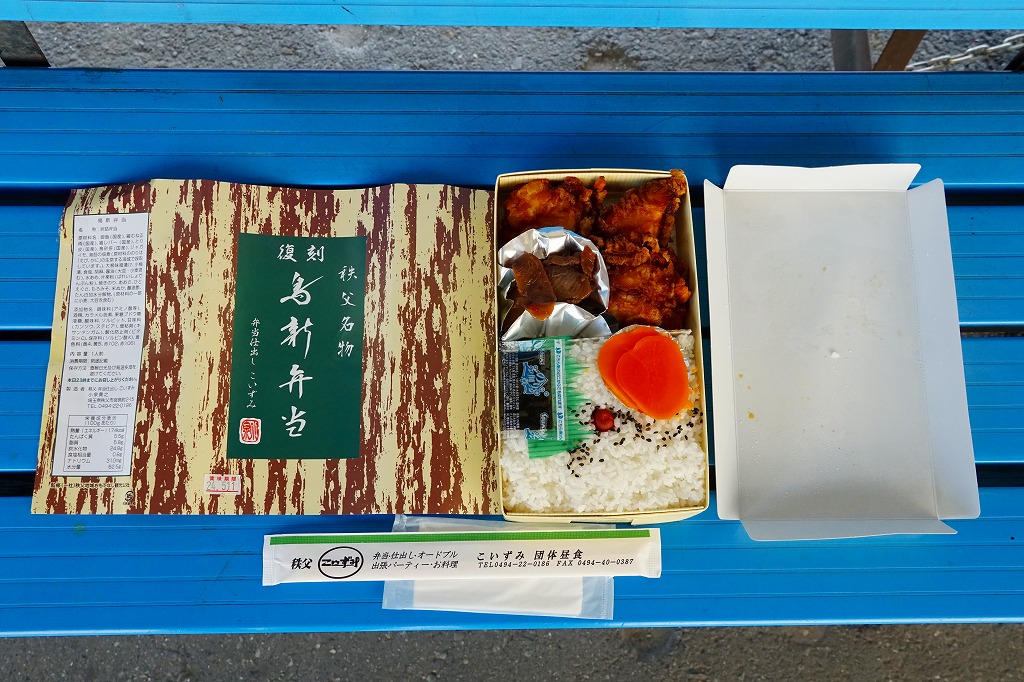 昭和の折箱といった感じの紙容器を、商品名を書いた竹皮柄の掛紙で包む。中身は日の丸御飯にたくあん、鶏むね正肉の唐揚げ、鶏レバー煮、とり皮、鳥砂肝、じゃがいも、海苔の佃煮。中身ぎっしり重量級で、油たっぷりな昭和の味。これに親しみや懐かしさを覚えるか、おっさん臭いと敬遠するか。駅へ午前中に来たら、温かい状態でいただけた。秩父市街の八尾百貨店でも買えるという。価格は2020年時点で700円、2023年時点で770円、2025年時点で850円。