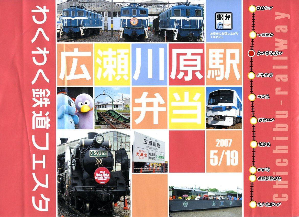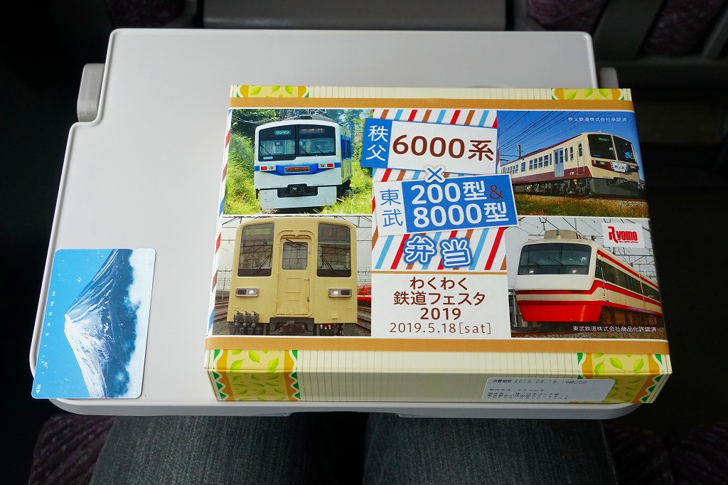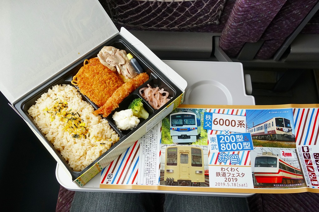 2019(令和元)年5月18日に秩父鉄道の広瀬川原車両基地で開催されたイベント「わくわく鉄道フェスタ2019」で販売されたお弁当。市販の仕出し弁当向けボール紙製容器に巻かれた掛紙には、秩父鉄道で急行列車に使われる6000系電車と、東武鉄道で特急りょうもう号に使われる200型電車、普通列車に使われる8000型電車の写真が使われる。