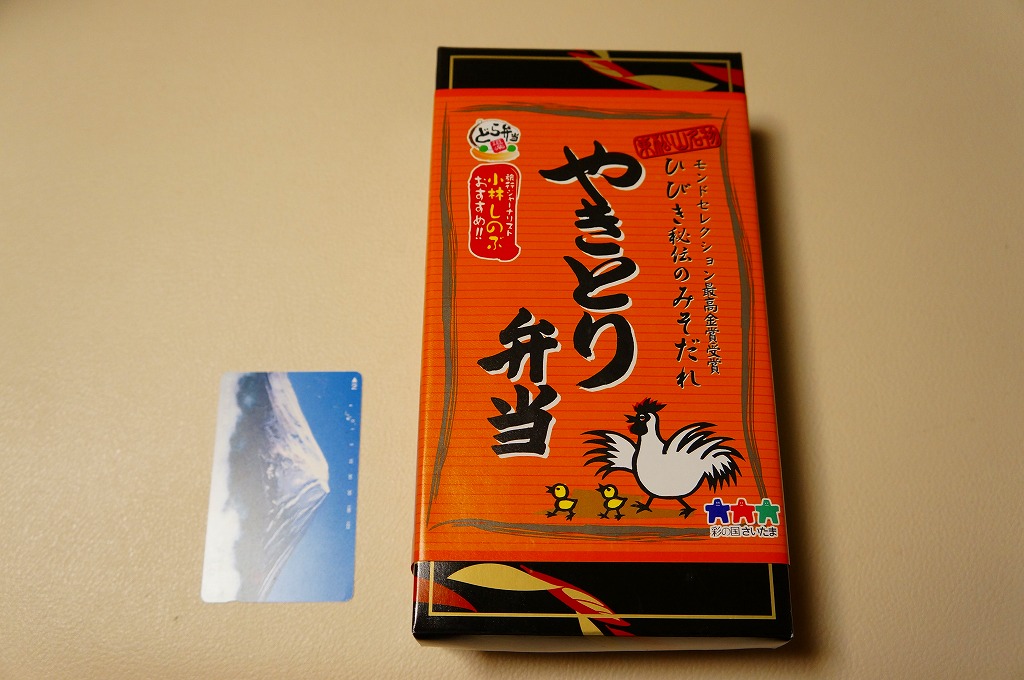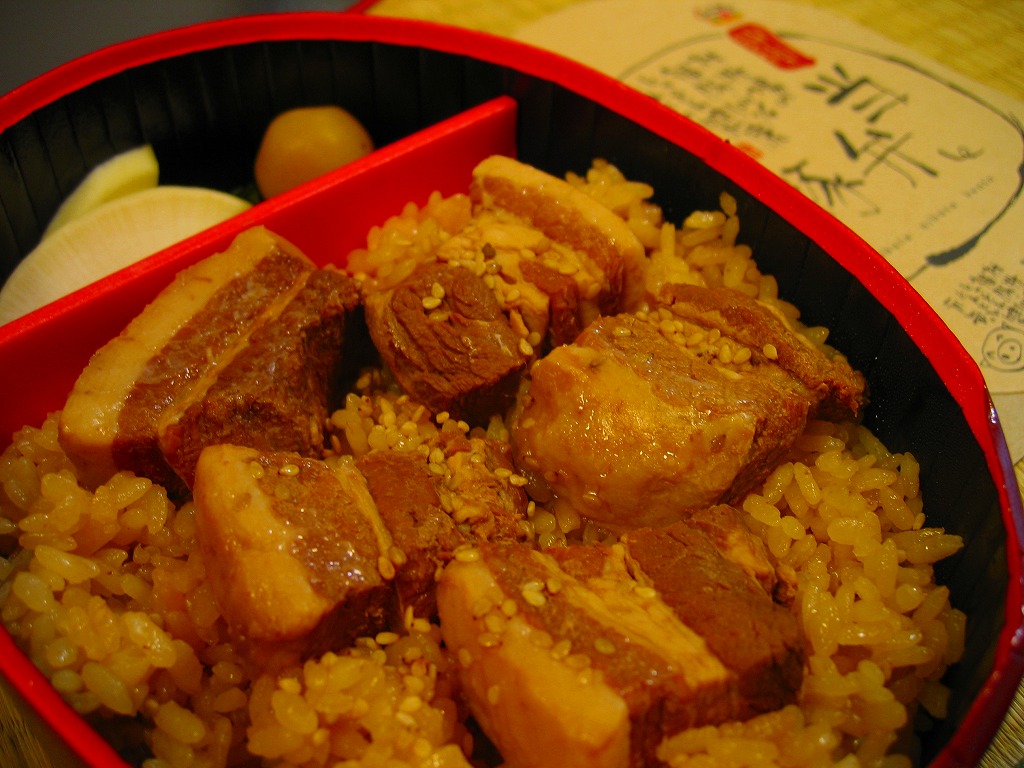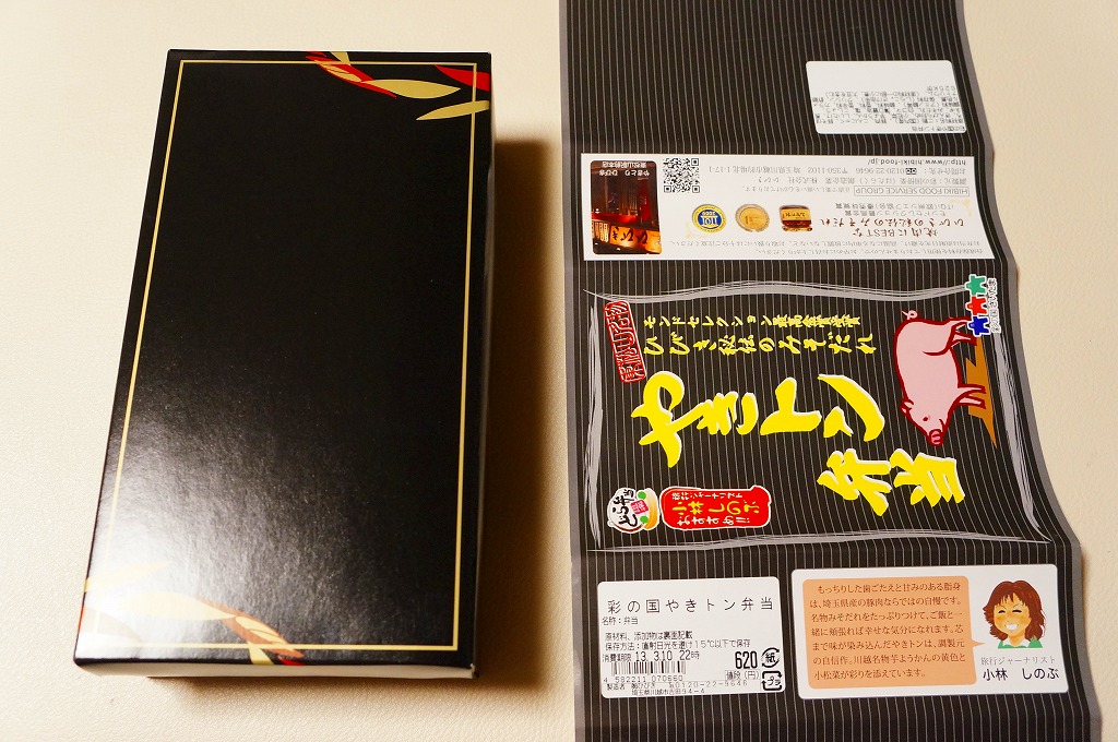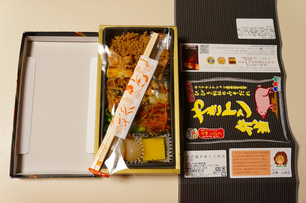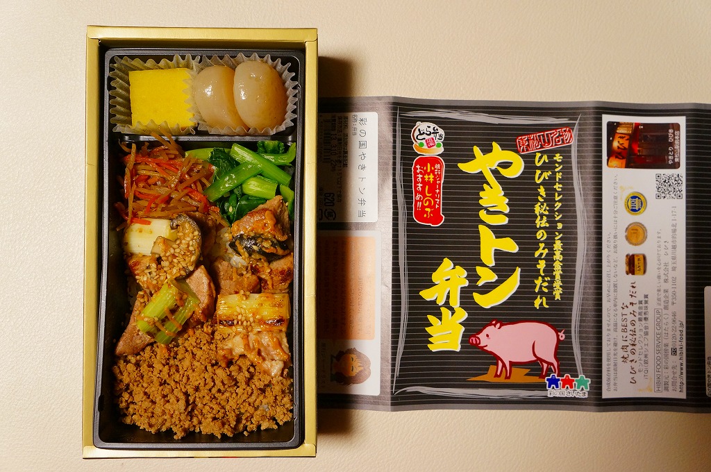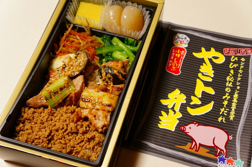 長方形の容器に白御飯を敷き、豚そぼろ、焼き鳥サイズの豚肉、細かいきんぴらごぼう、ネギ、しいたけ、小松菜で覆い、玉こんにゃくと芋ようかんを添えるもの。主役の豚肉は脂肪がギシギシ歯に引っかかる感じでうまくなく、秘伝のみそだれやそのピリ辛風味は、特に感じなかったような。980円の駅弁と容器やつくりは同じなのに、肉の違いを考えても風味がまるで違うのは、価格の差だろうか。価格は2013年の購入時で620円、2014年4月の消費税率改定で638円。