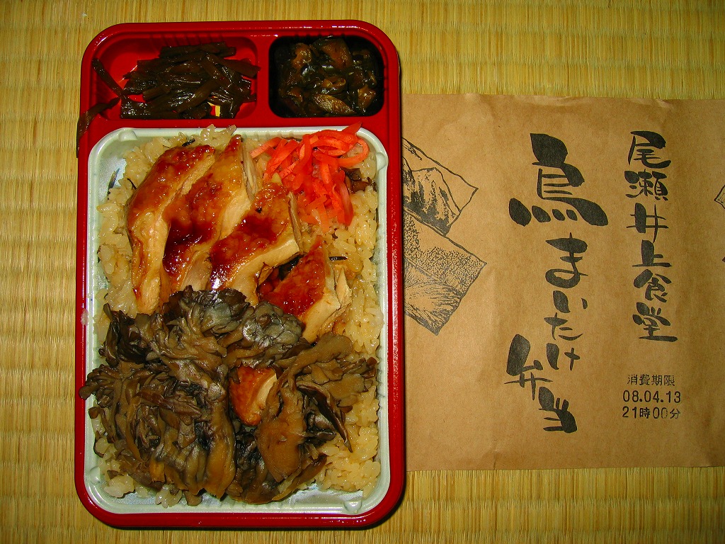 上記の駅弁「尾瀬井上食堂まいたけ弁当」の鶏肉増量版で、同じく上里サービスエリアで2008(平成20)年4月4日に発売。プラ製の惣菜弁当容器に透明な上げぶたをして、割りばしやおしぼりとともに輪ゴムでしばり、商品名を書いた掛紙を巻いてテープで留める。中身はマイタケの混ぜ御飯の上にマイタケと鶏照焼を半分ずつ載せ、紅生姜やわさび茎などの付合せを添えるもの。