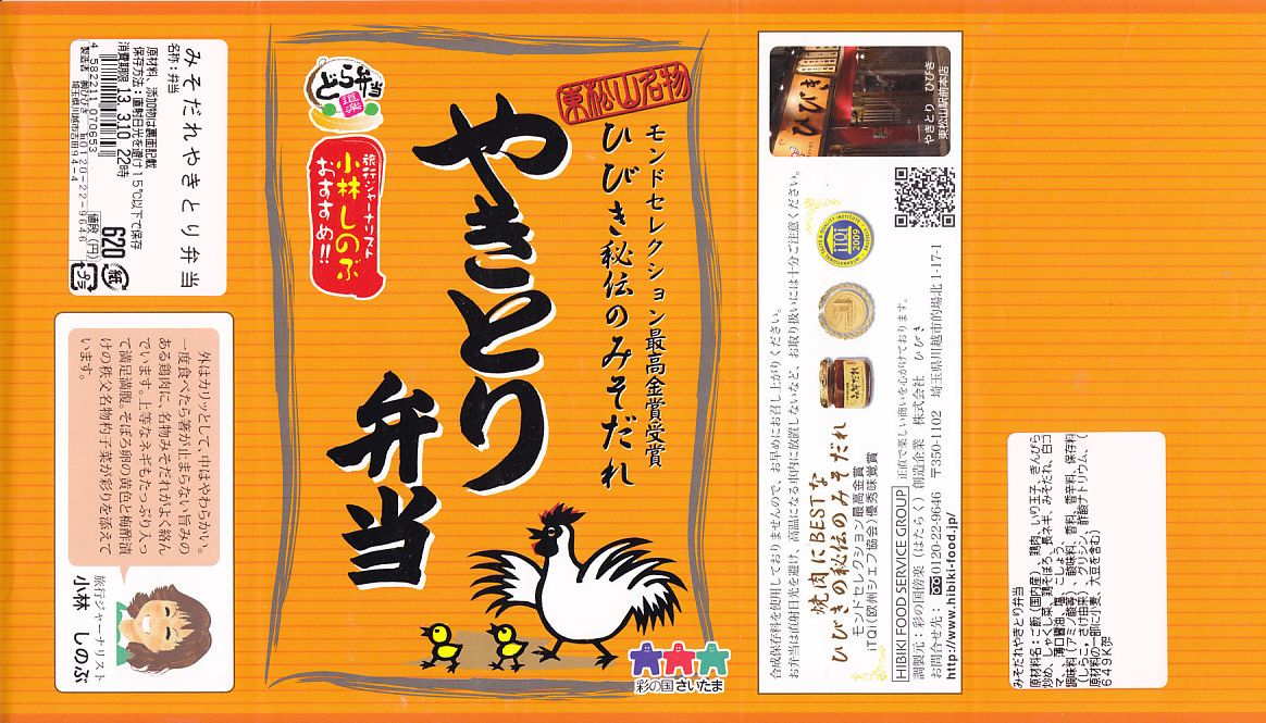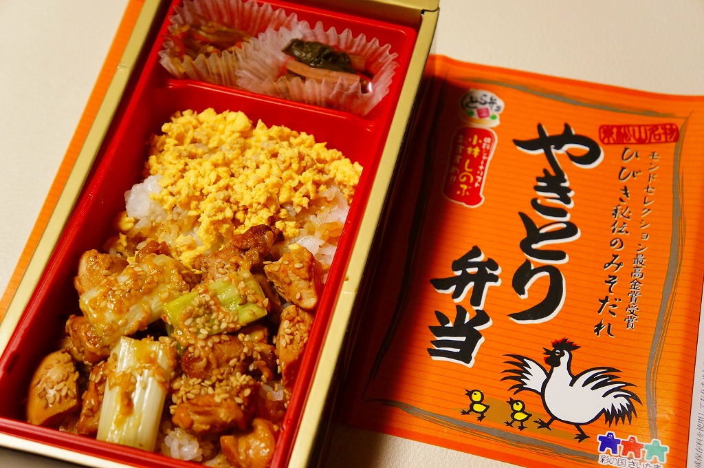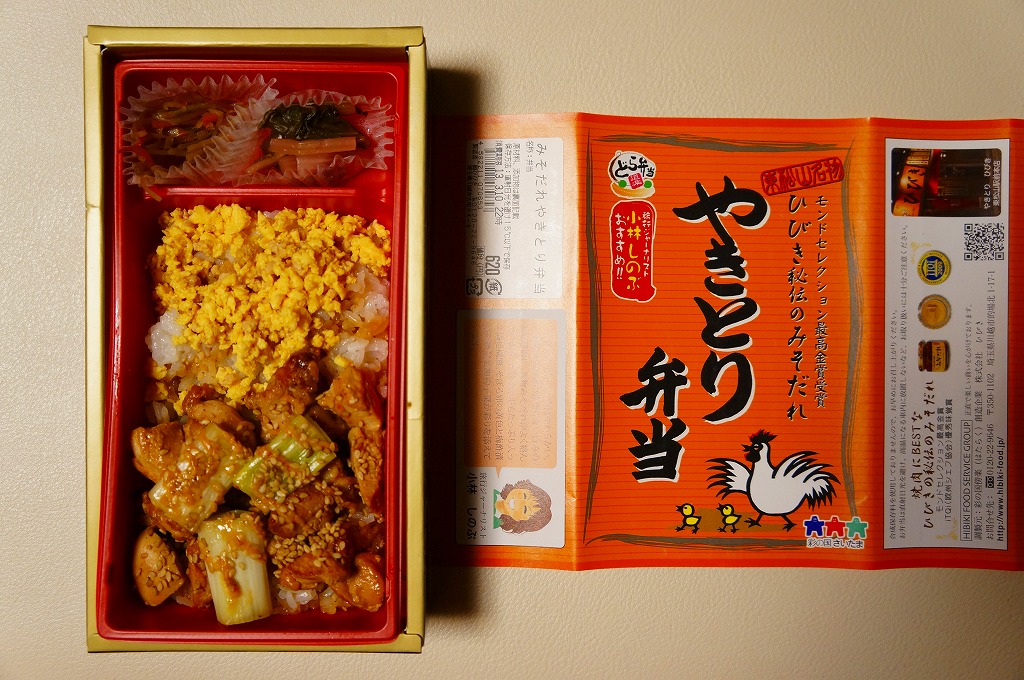 上の「やきトン弁当」と同じ容器に白御飯を敷き、焼き鳥サイズの鶏肉、炒り卵、ネギを載せて、しゃくし菜漬けと細かいきんぴらごぼうを添えるもの。主役の鶏肉は身がザラザラするもサクサクな歯応えに特徴があり、秘伝のみそだれやそのピリ辛風味は、特に感じなかったような。価格は2013年の購入時で620円、2014年4月の消費税率改定で638円。