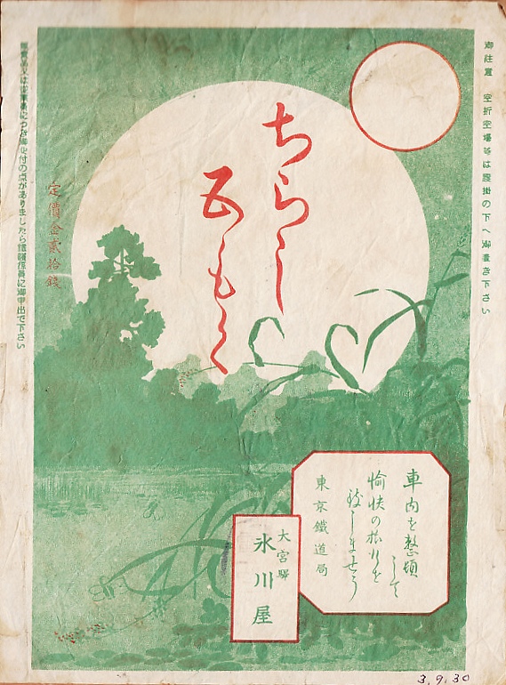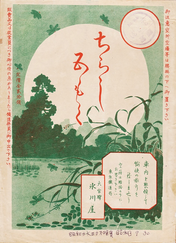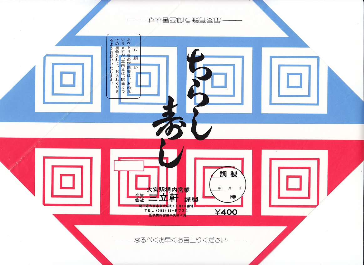 1930年代、昭和時代初期のものと思われる、昔の大宮駅弁の掛紙。収集者が1928(昭和3)年9月30日の調製と判断し、下部に「3.9.30」の数字を書き入れた。しかし調製印で調製年月日を判断できる下記の掛紙「ちらしごもく」とは、掛紙の左右の注意書きが手書き文字か活字かの違いがあることから、こちらのほうが新しいものではないかと思う。それ以外の絵柄や記載事項は、まったく同じ。