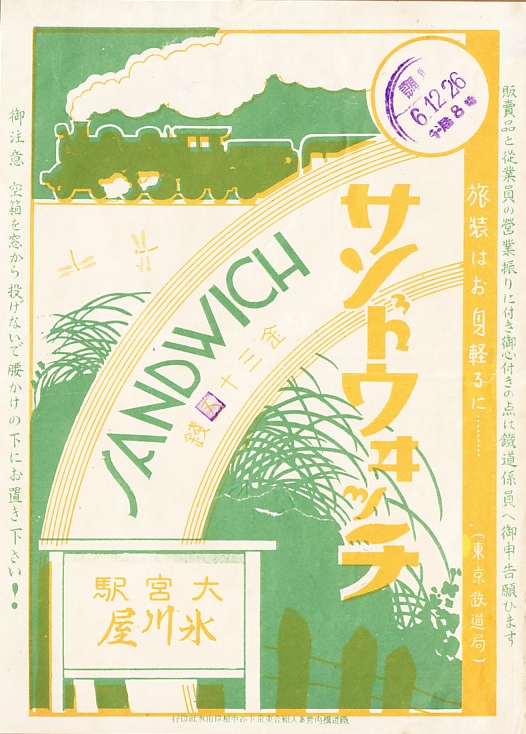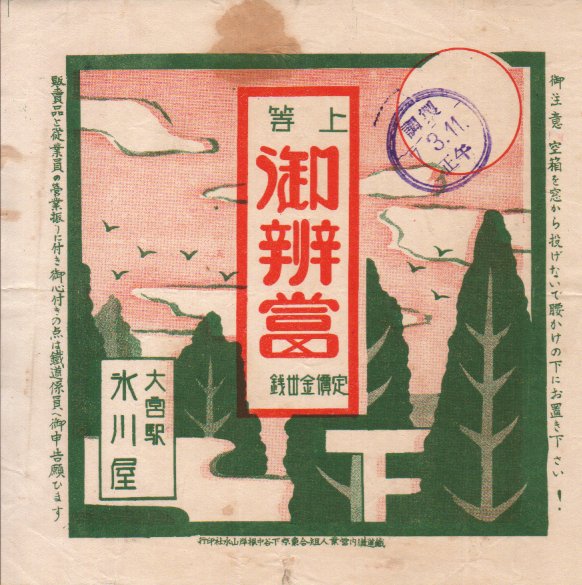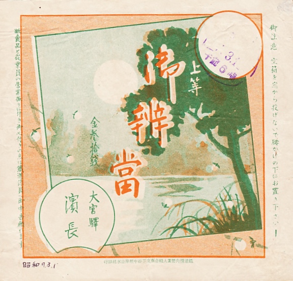 1928(昭和3)年9月30日16時の調製と思われる、昔の大宮駅弁の掛紙。掛紙に描いた湿地か池沼は、現在の見沼公園あたりの風景かどうか。収集者は大正時代か昭和時代か不確実だと掛紙の下部に記したが、大正3年であれば調製印が、少なくとも調製印を押す欄がないはずなので、昭和3年のものと判断した。
