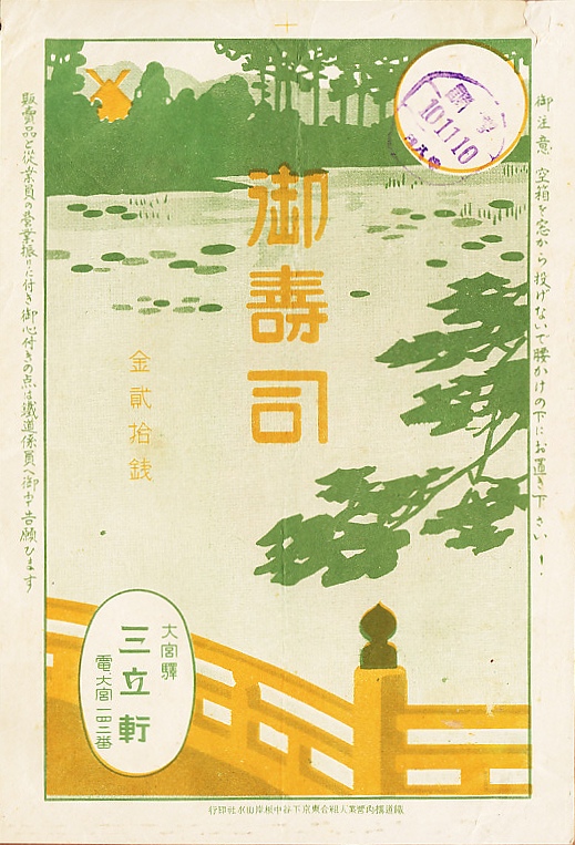 1935(昭和10)年11月10日の調製と思われる、昔の大宮駅弁の掛紙。大宮氷川神社の神池を描いたのかどうか。