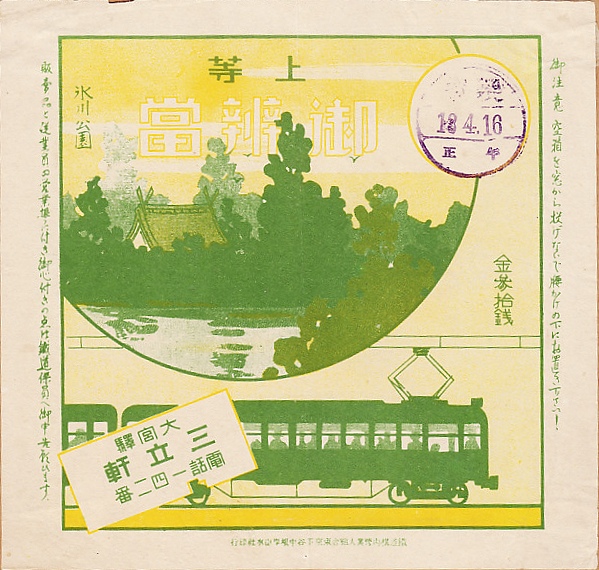 1938(昭和13)年4月16日正午の調製と思われる、昔の大宮駅弁の掛紙。大宮氷川神社のある氷川公園と、大正時代風の電車のシルエットが描かれる。1932(昭和7)年9月の電化で、現在の京浜東北線の電車が大宮駅へ乗り入れた。