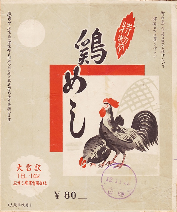 1950年代、昭和20年代の、12月11日12時の調製と思われる、昔の大宮駅弁の掛紙。大館駅の鶏めしの掛紙に似たような感じ。左下に「人造米使用」とあり、米の流通が改善する1955(昭和30)年より前、あるいは駅弁に等外米が普及する1952(昭和27)年より前のものだろうか。