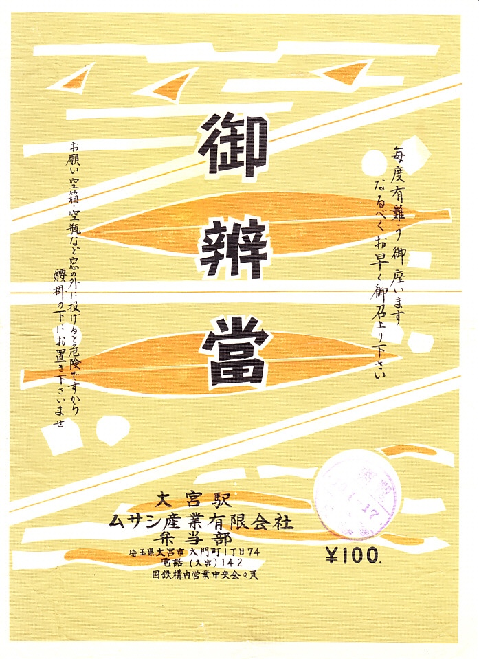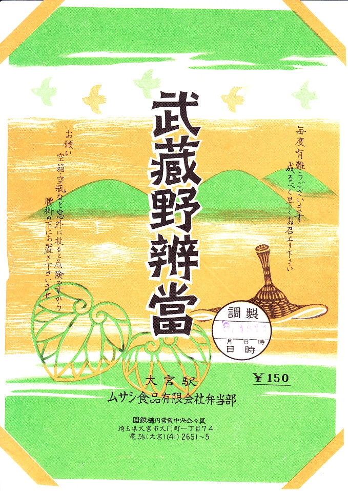 1960年代の、8月18日18時の調製と思われる、昔の大宮駅弁の掛紙。武蔵野弁当とは、つまり特製幕の内弁当のことで、1960年代の前半に大宮駅で売られたらしい。
